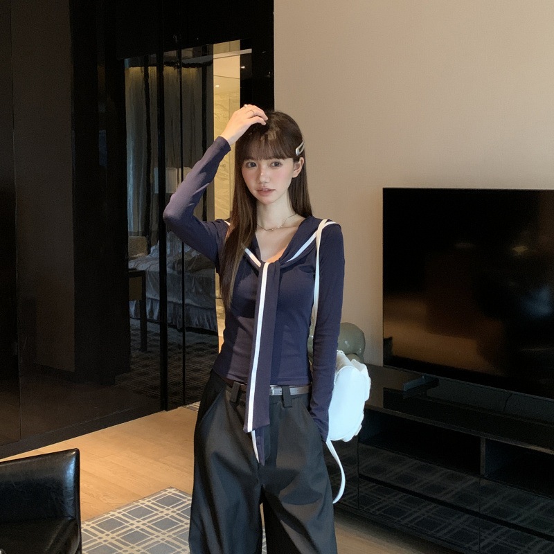 【最安値に挑戦】【人気商品】 Vネック ニット紺学院風マリンネック長袖Tシャツレディース秋インナーボトム
