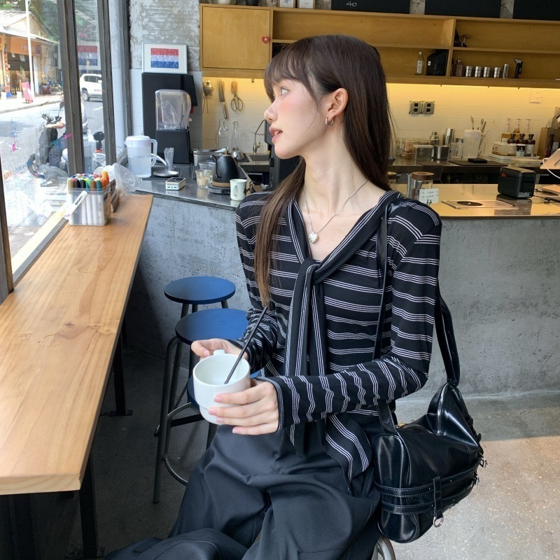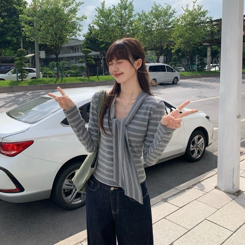 【最安値に挑戦】【人気商品】 Vネック ニットグレーのフェイク2枚ストール長袖Tシャツ女性秋独特きれいなボトムブラウス女性インナー