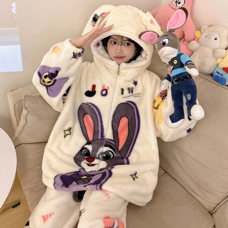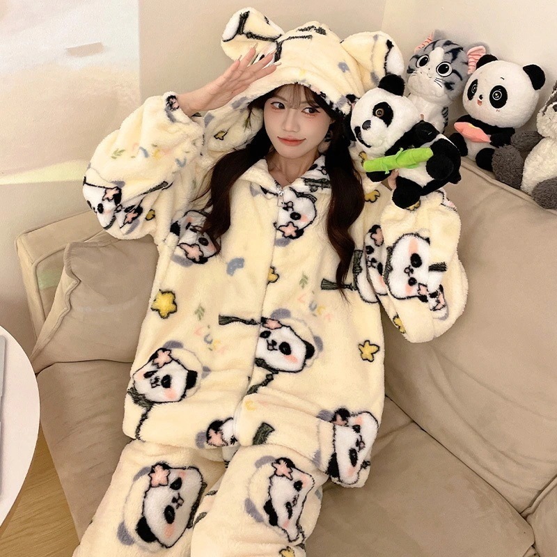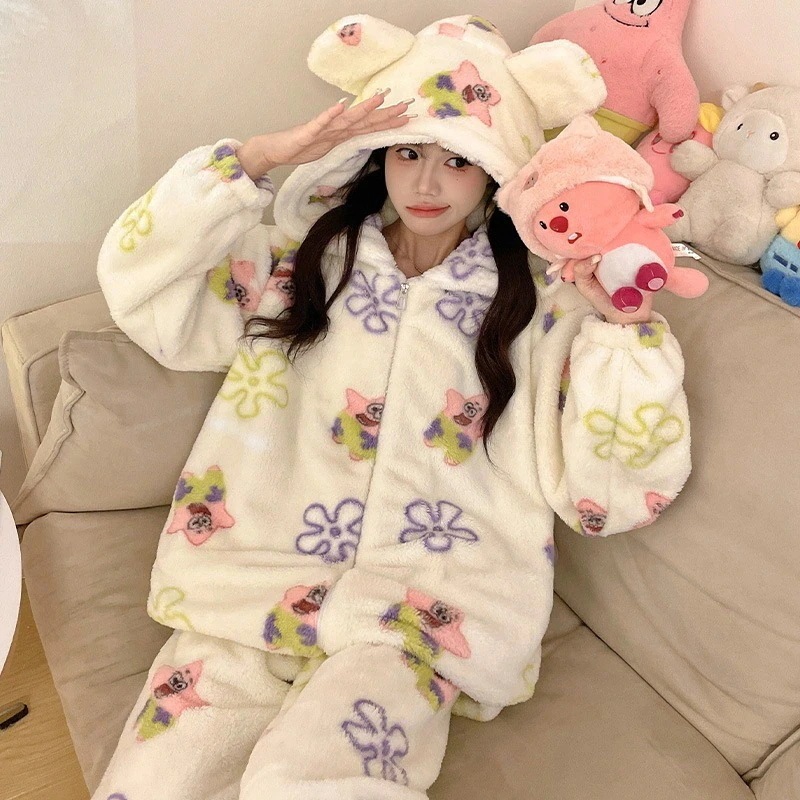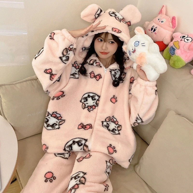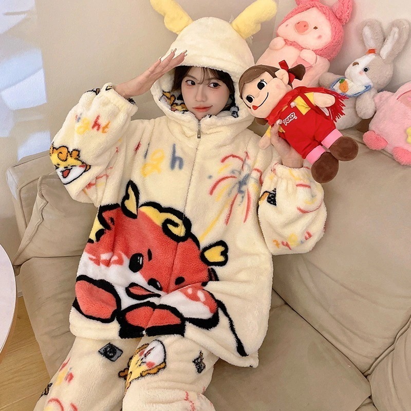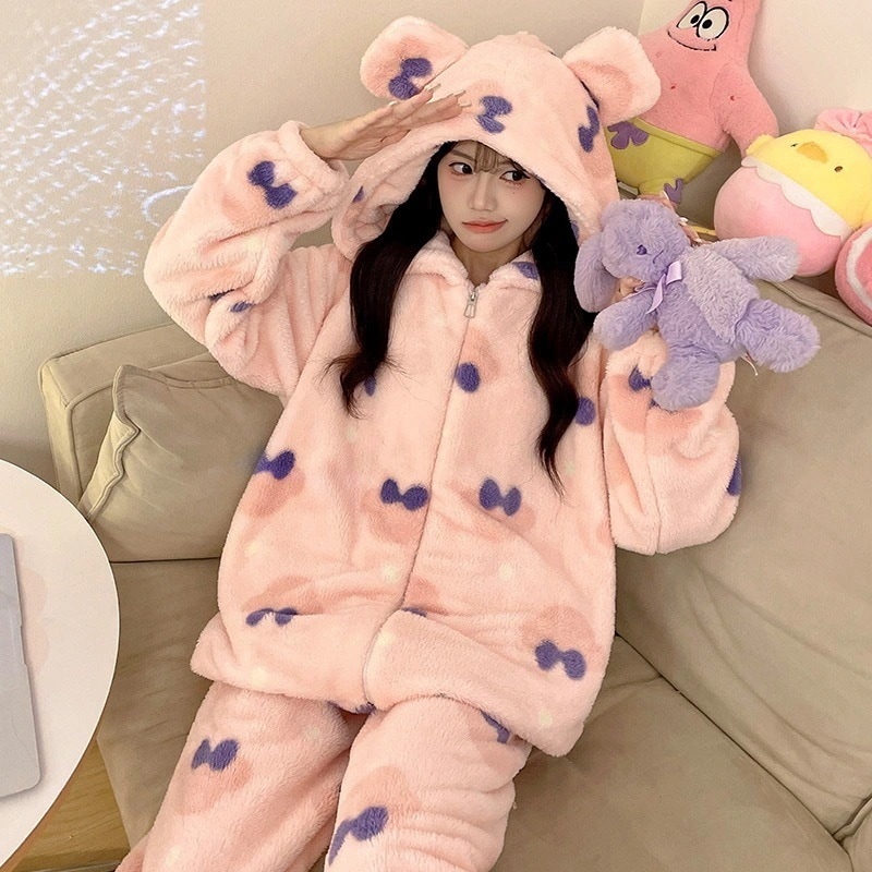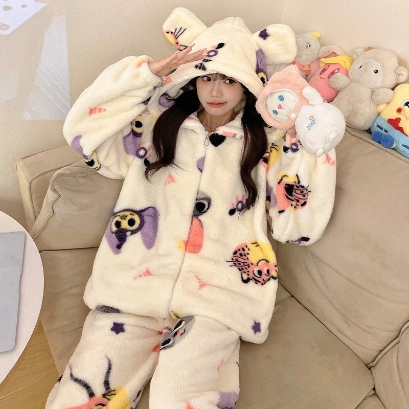 【最安値に挑戦】【人気商品】【急速出荷】2025 ルームウェア 秋冬 新作 レディースパジャマ フランネル 厚手 漫画 ホーム フード付き ジップ 冬 セット