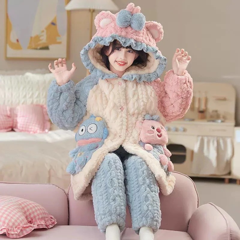 【最安値に挑戦】【人気商品】【冬季限定】ガールズベアフリースパジャマ 三层夹棉 + 加绒加厚 厚手保温 卡通柄家居服 ベビー~学童サイズ対応 お腹冷え防止 肌に優しい 寝間着・リビング着用 OK