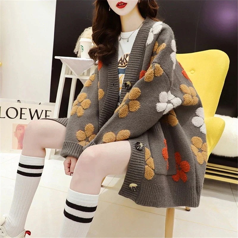 カーディガン レディース セーター ニット トップス 上品 ゆったり 長袖 ドロップショルダー Vネック 花柄 華やか デイリー フェミニン ガーリー カジュアルスタイル ビッグシルエット