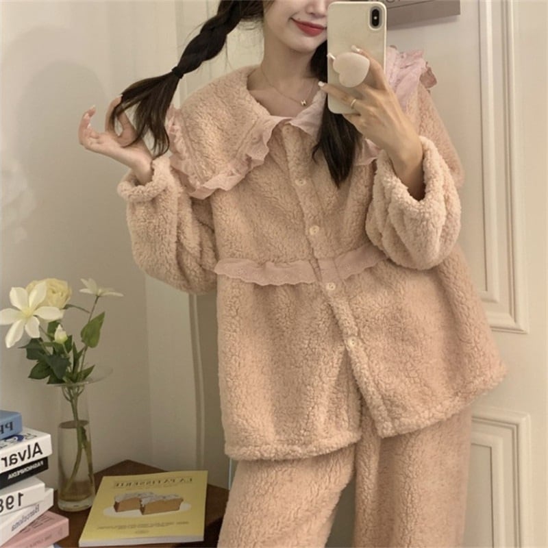 韓国ファッション裏起毛 2点セット 柔らかい ウェアパジャマ レディース セットアップ もこもこパジャマ 肌触り部屋着 スウェット+ズボン超保温 上下セットパジャマ