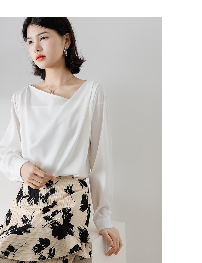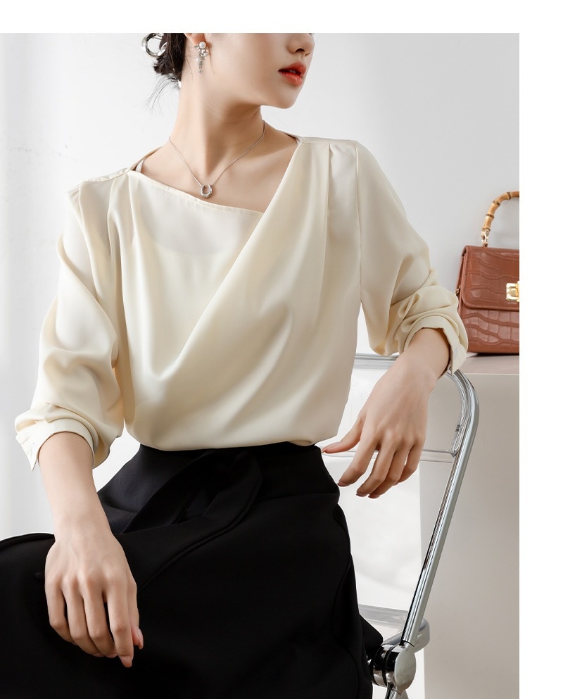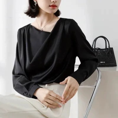 新作 しわ加工 光沢感 エレガント 韓国風 優雅 新品 大人気 ドレープネック ロングスリーブ ブラウス 通勤 トップス