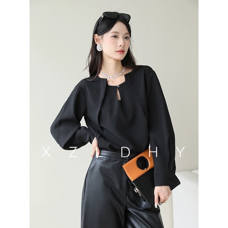 デザイン感 ツーピース風 シャツ 春 新作 レイヤード ロングスリーブ 新品 大人気 トップス スリミング ブラック ブラウス