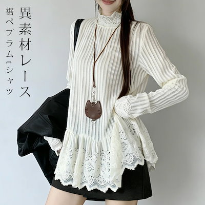裾レース ペプラム トップス レディース 春 秋 冬 秋冬 裏起毛 起毛なし プルオーバー カットソー Tシャツ スタンドカラー 裾ペプラム 切り替え プチハイネック インナー 長袖 レイヤード ゆっ