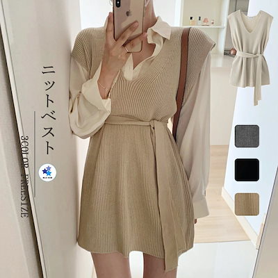 ベスト ニットベスト レディース ニット セーター チュニック ニットセーター トップス カットソー 重ね着 ノースリーブ ニットベスト 無地 vネック ウエストベルト 柔らかい 可愛い 通勤 通学