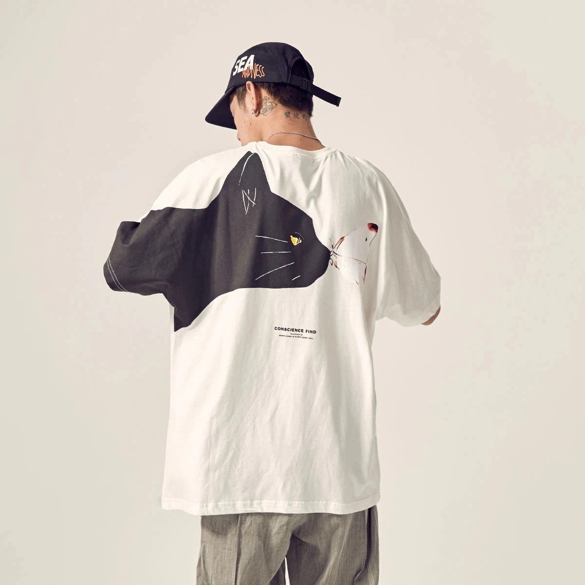 メンズ 半袖 花柄 クルーネックTシャツ ゆったり 五分袖 トップス 韓国 流行り シャツ 猫の恋 カジュアル上着0