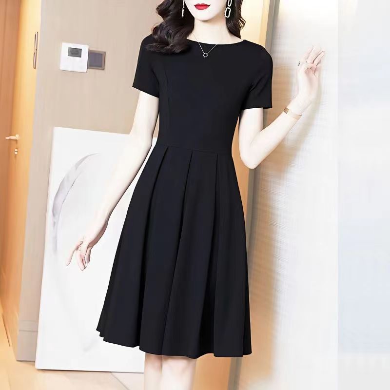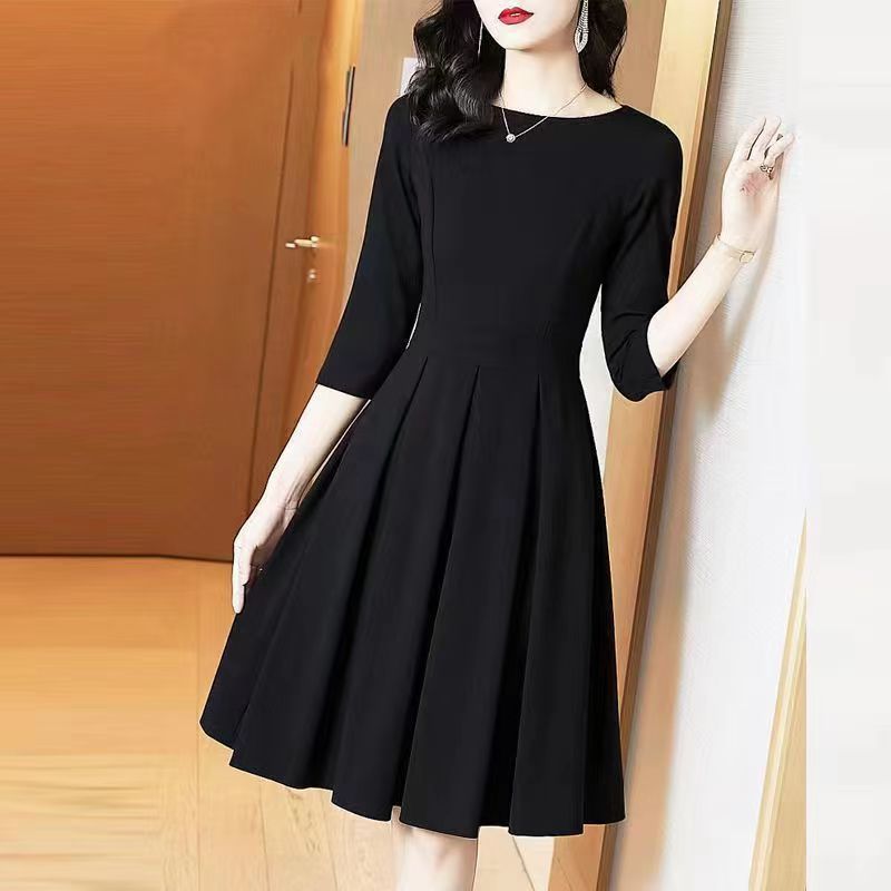 ブラック フォーマル ワンピース 喪服 礼服 きれいめ 黒 クルーネック フレア Aライン ドレス ひざ丈 長袖 代 30代 40代 50代 レディース 無66350