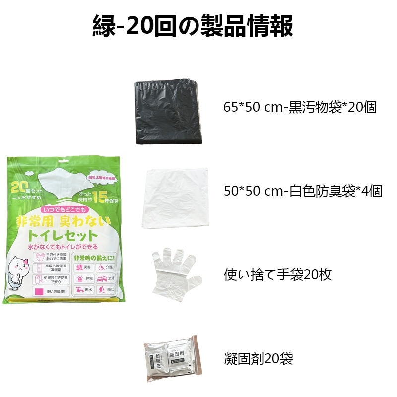 非常用トイレセット 20回分 強力な凝固剤 使い捨て手袋 汚物袋 防臭袋 大容量 抗菌 消臭効果 長期保存可能 便器がない時 緊急時 非常用 地震 台風 豪雨 bs0070