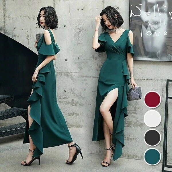 ドレス 大人 ピアノ 発表会 ロングドレス 演奏会 結婚式 母親 ピアノ発表会 黒 袖付き ロング サイドスリットドレス vネック 肩出し フリル 二次会 背中開き カクテルドレス 緑 グリーン ワン