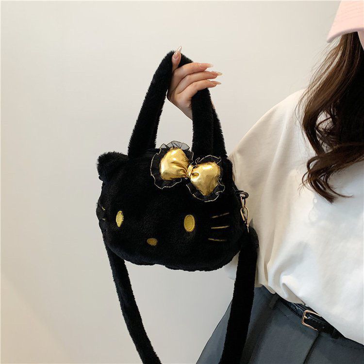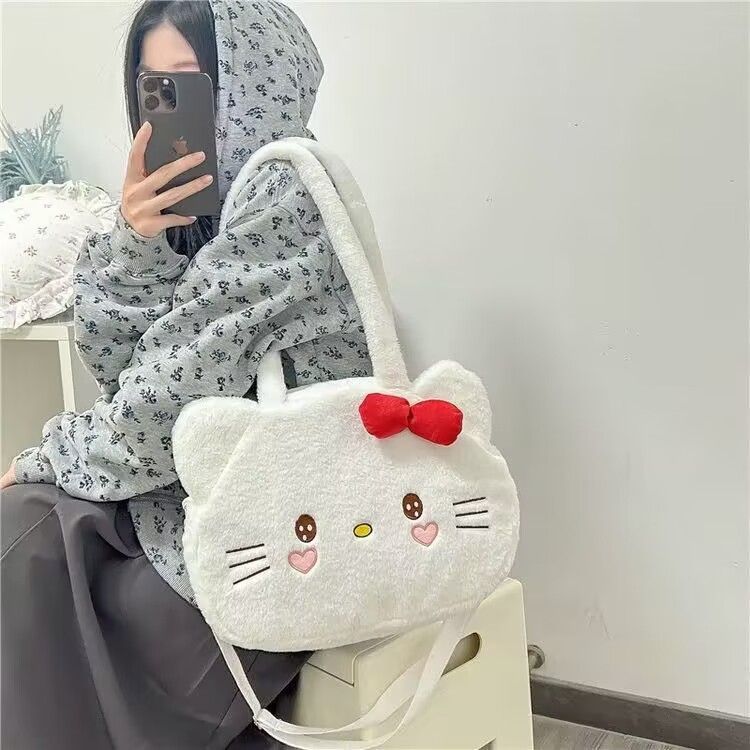 クーポンハローキティ斜め掛けベルベットバッグサンリオ秋冬毛むくじゃら手提げ通勤バッグかわいい収納バケツバッグ出荷が早い
