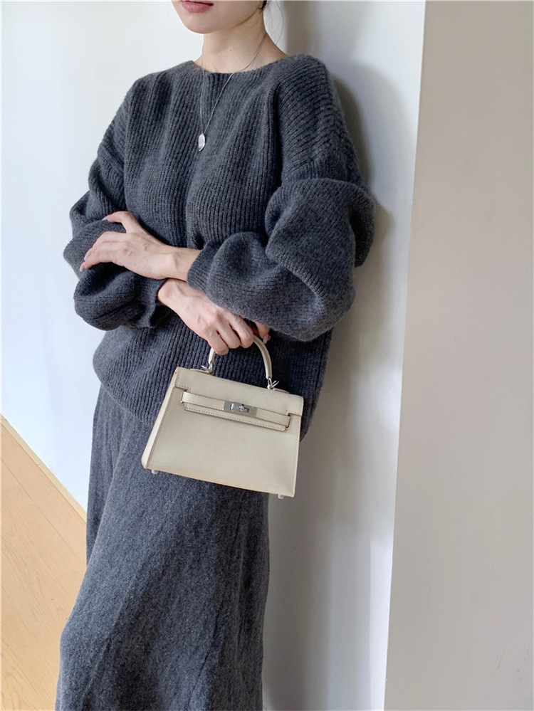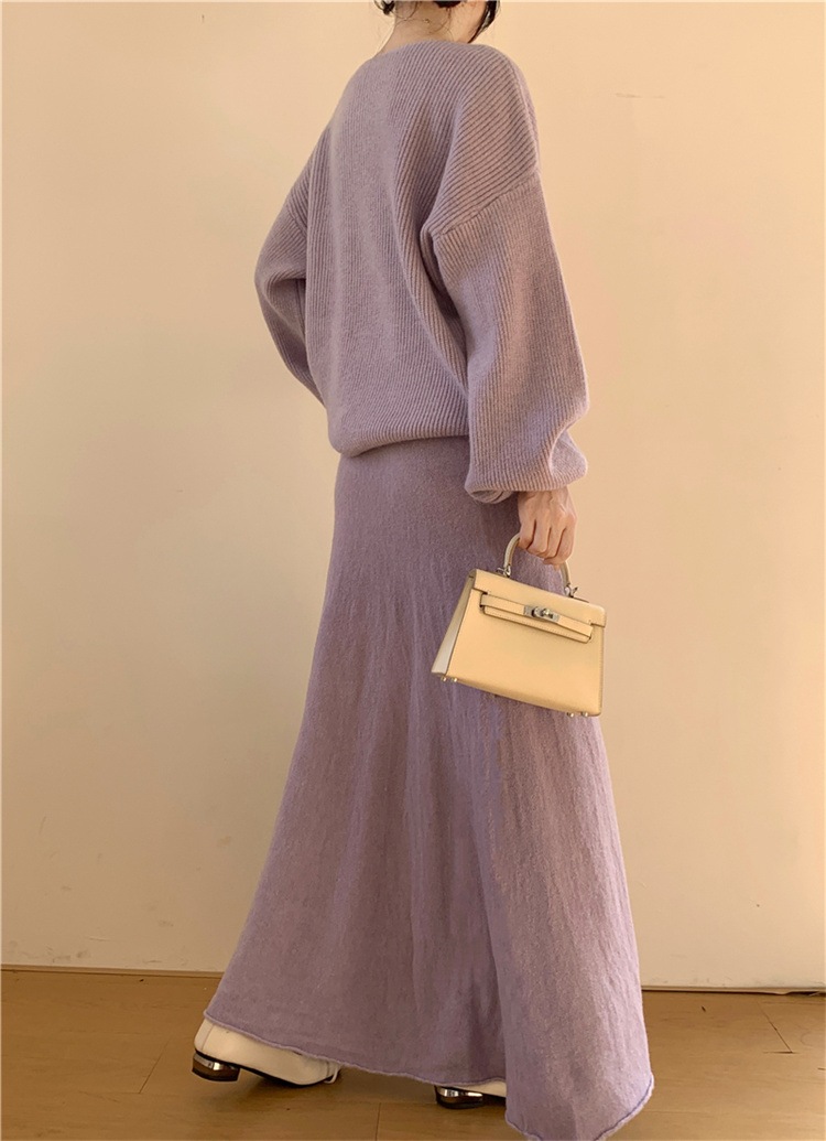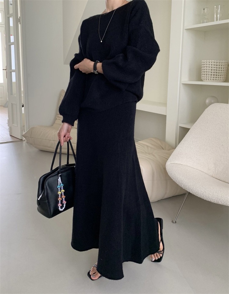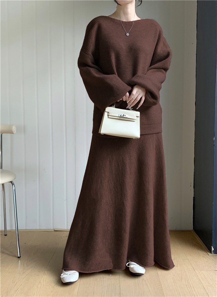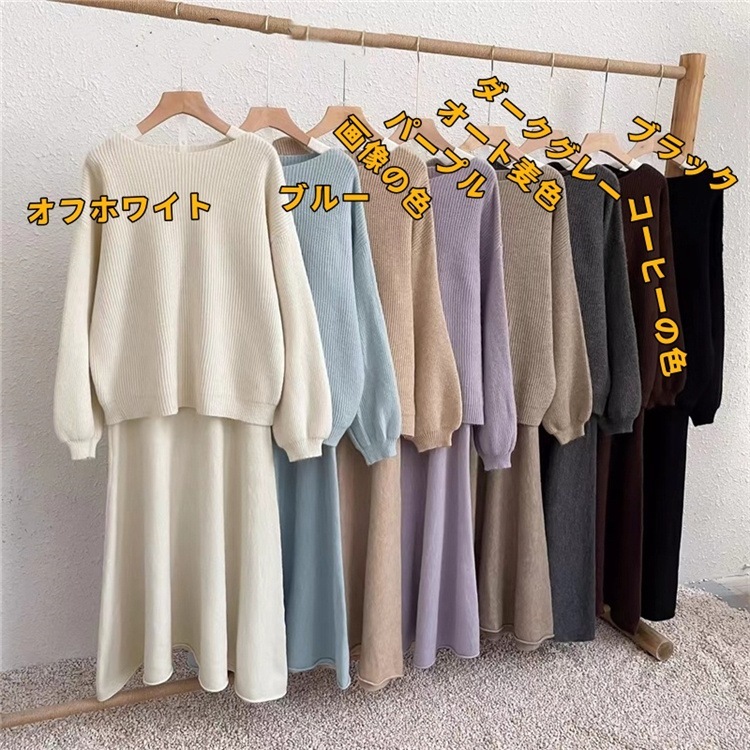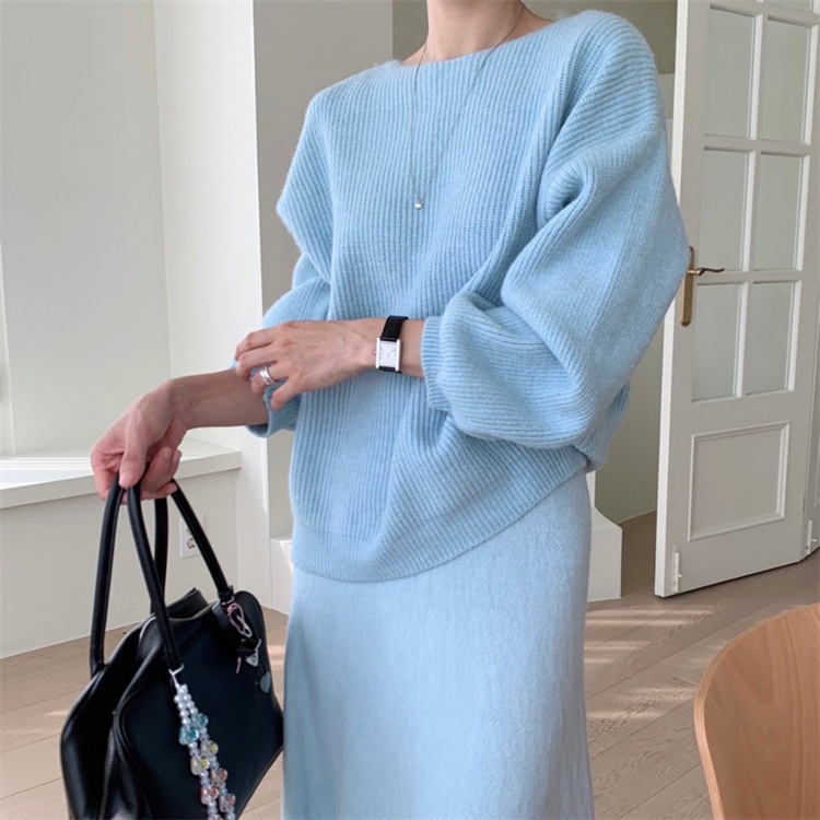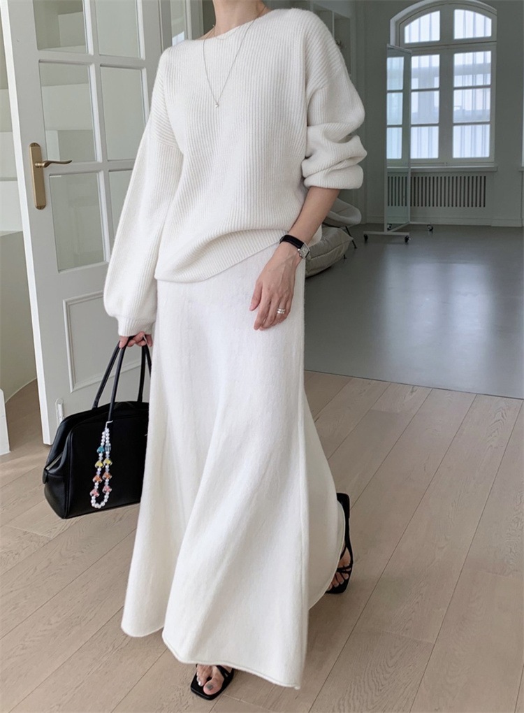 韓国ファッション スカート ロングスカート カットソー 怠惰な風 長袖 ラウンドネック セーター セットアップ ニットトップス 上着