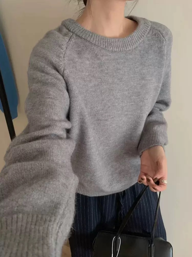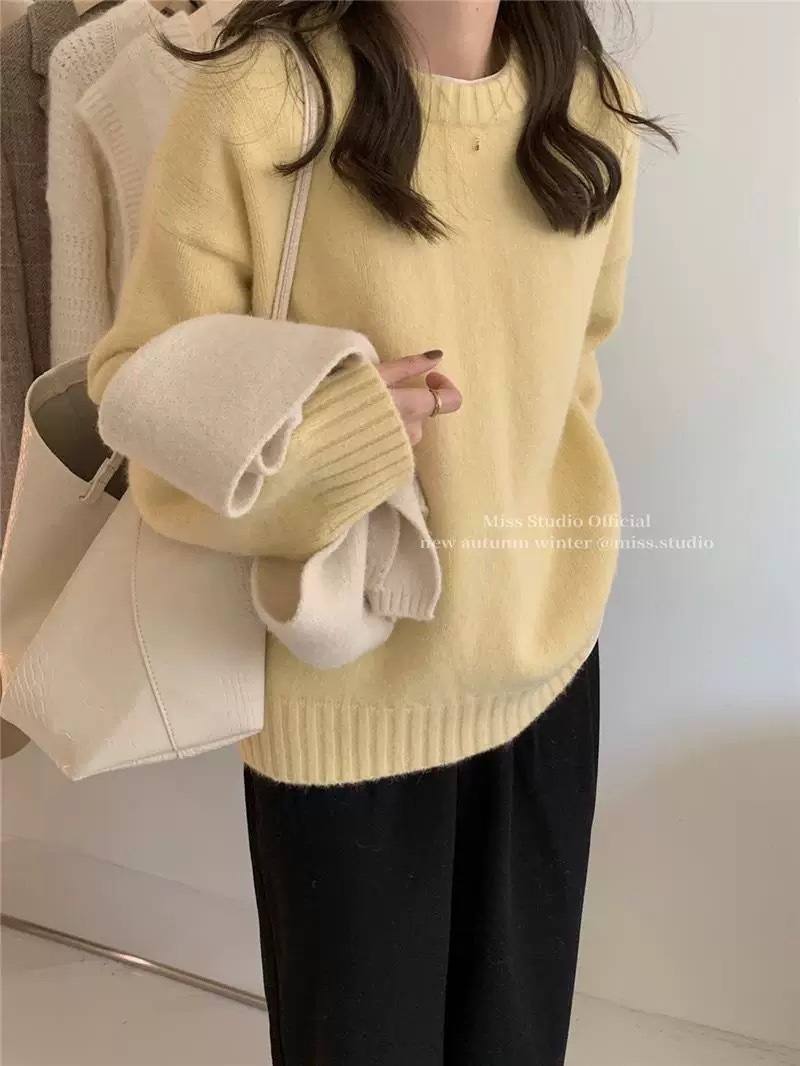 厚手!秋冬 丸首 レザータグ キャンディカラー プルオーバー セーター 女性 韓国風 ゆったり セーター