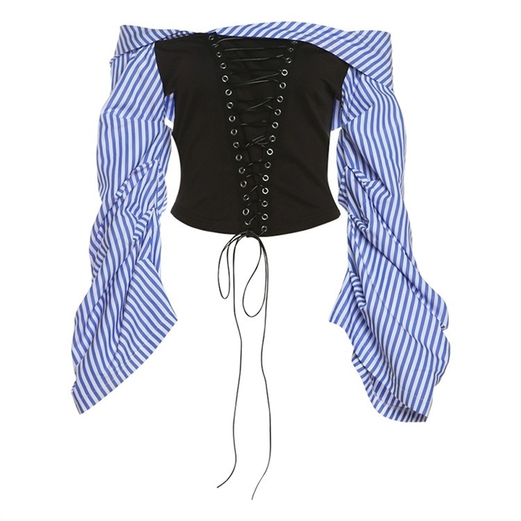 INSスタイル ユニークなデザイン シャツ トップス ストライプ スリム つなぎ ギャザリング ブラウス 腰を締める 長袖 上着 バンディング