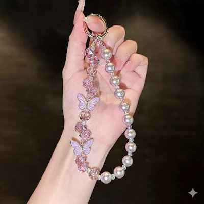 オーロラピンクバタフライ&パール・クリスタルビーズストラップ