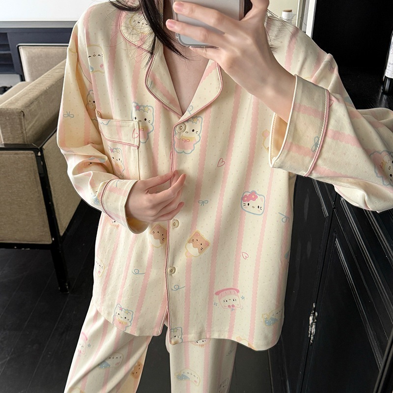 女性用パジャマ 春の 純綿 襟付き カートゥーンプリント 長袖 ホームウェアセット