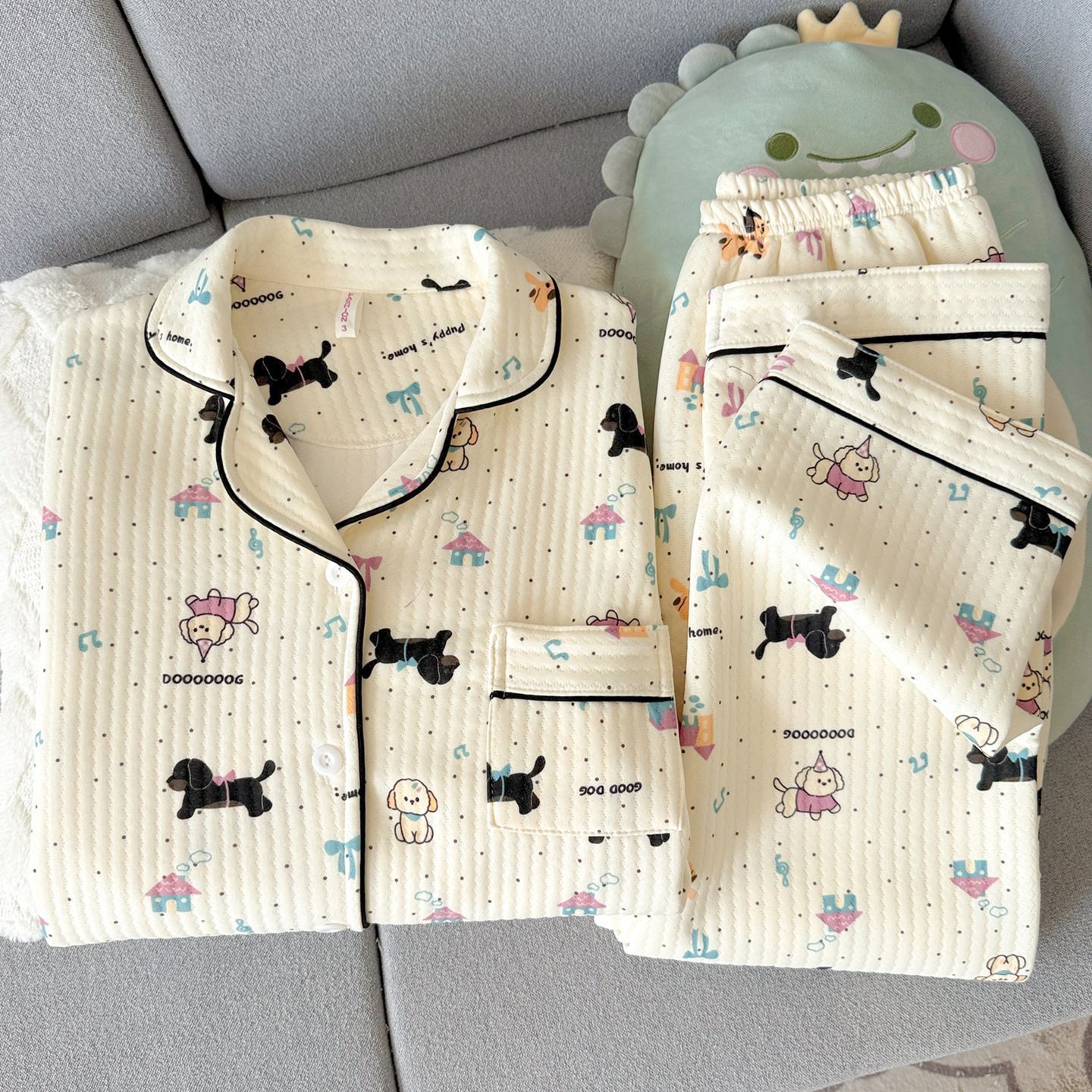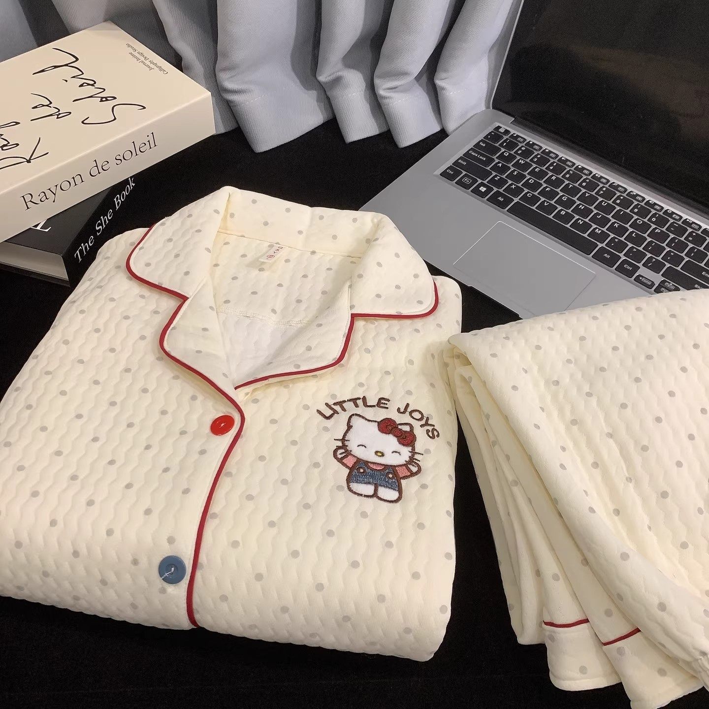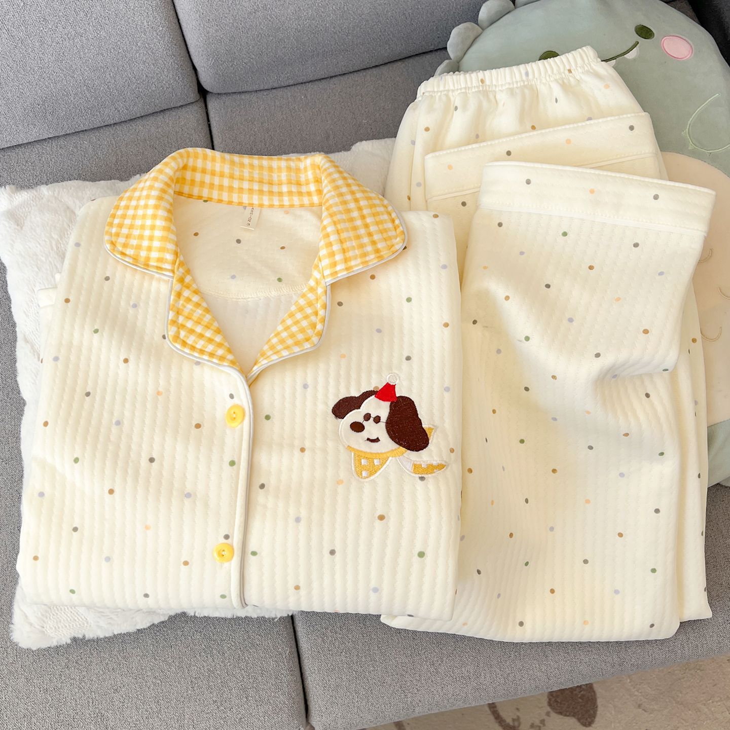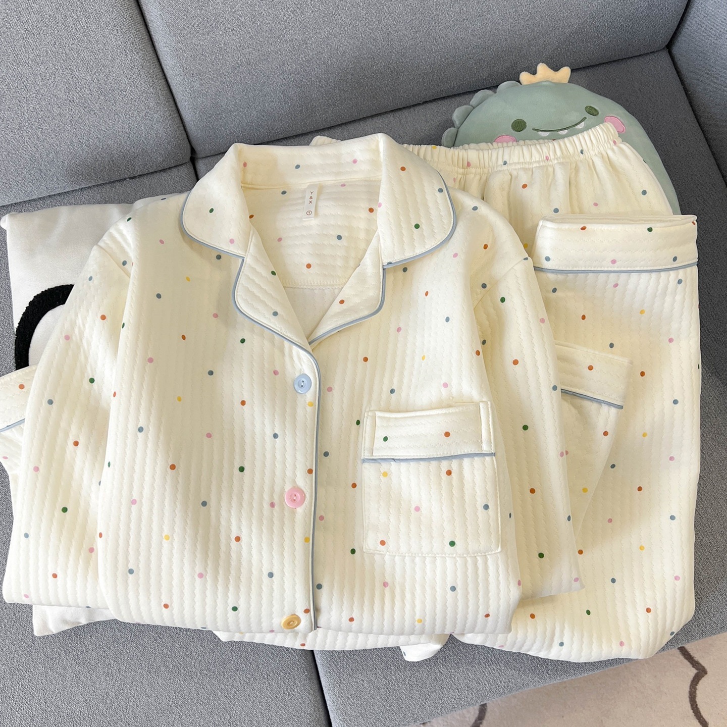 ドット刺繍猫柄レイヤードセットパジャマ女性用秋冬エアコットン厚手保温長袖学生ホームウェア