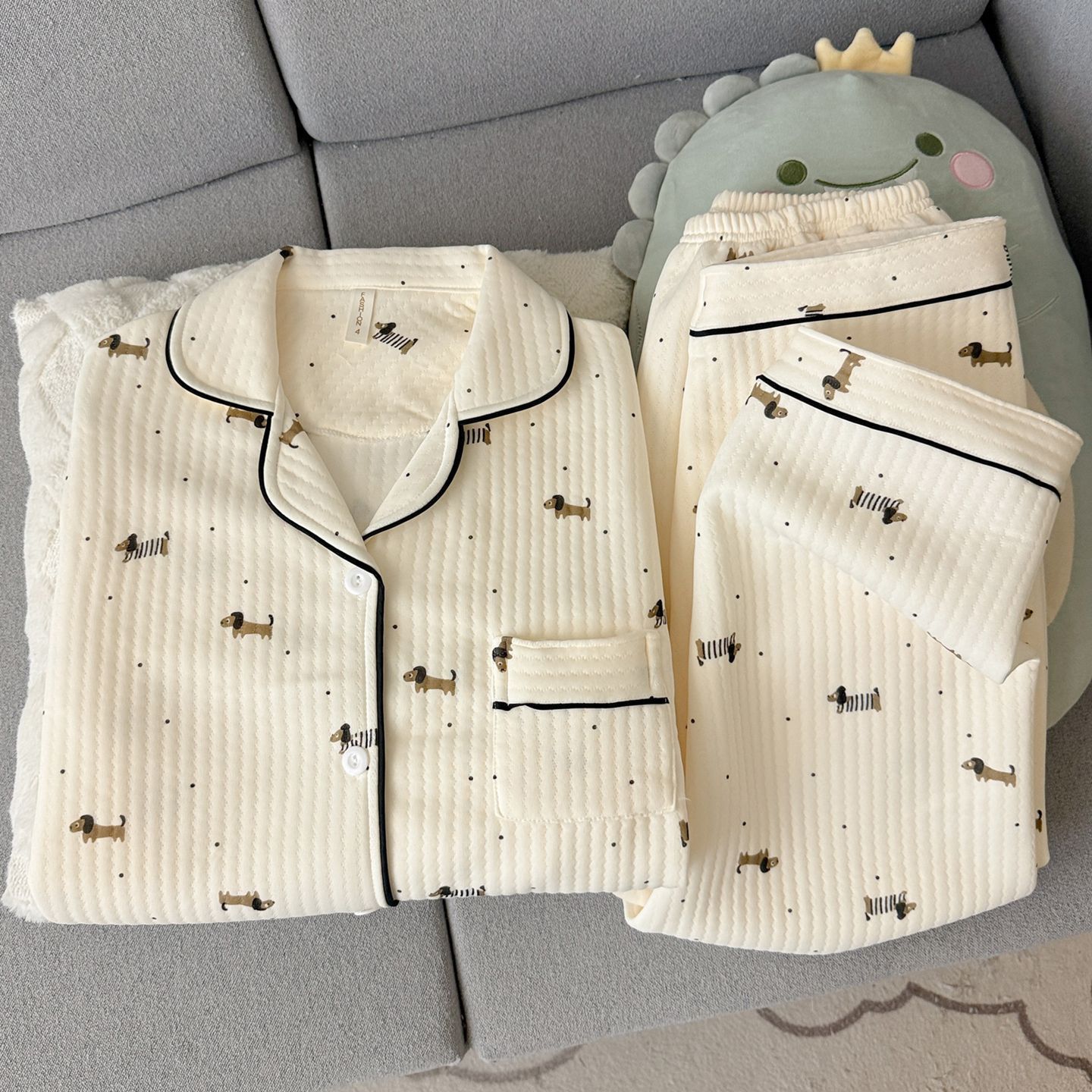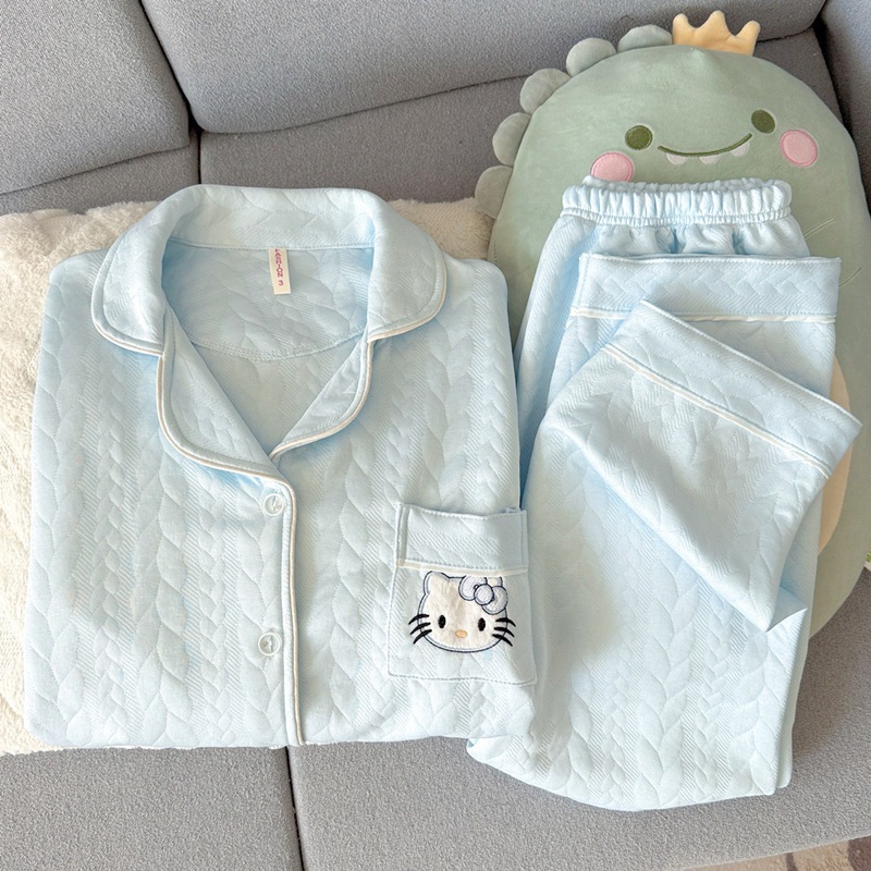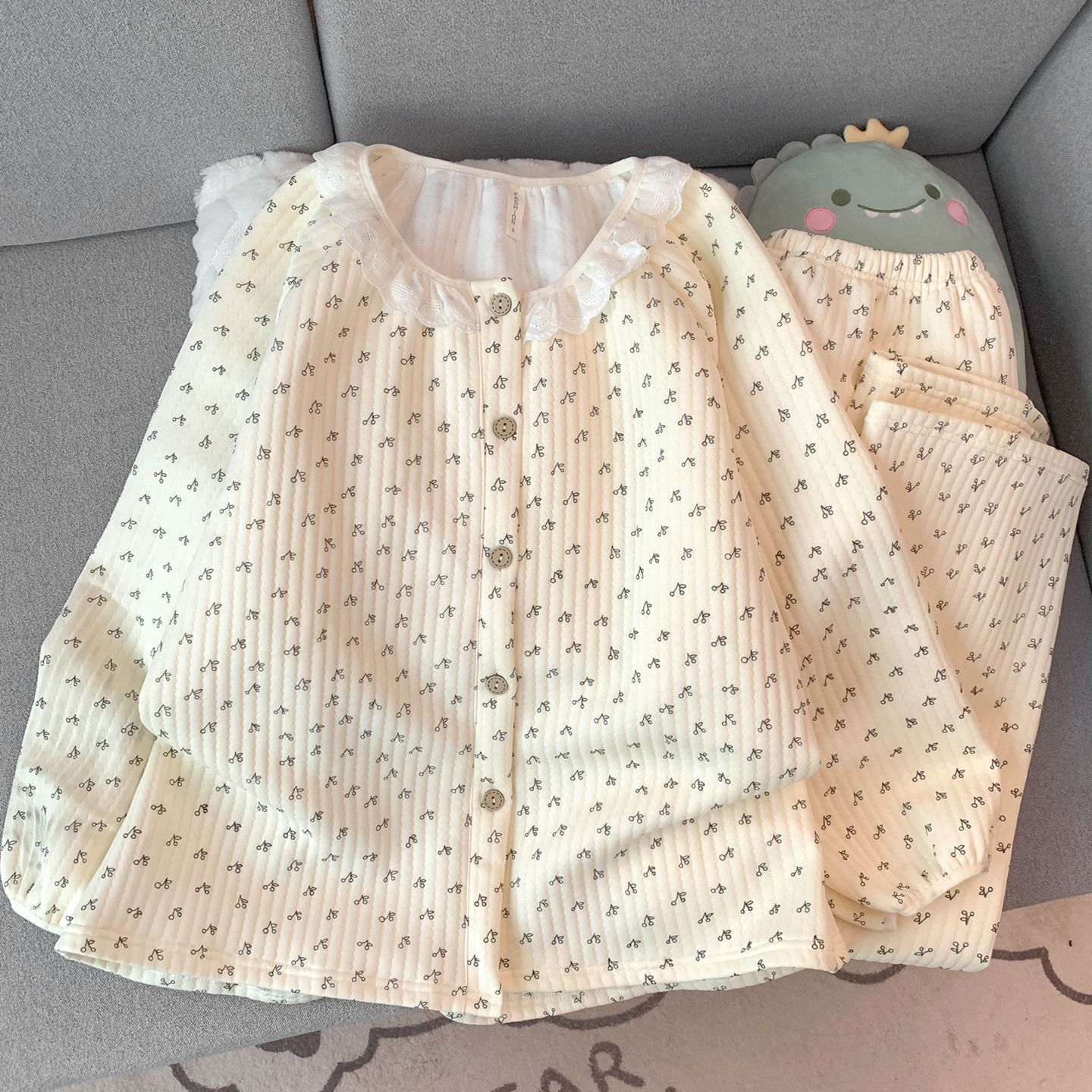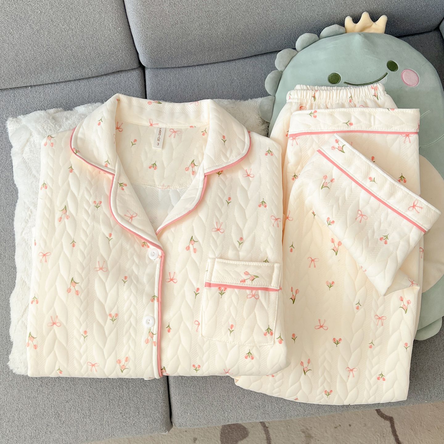 ドット刺繍猫柄レイヤードセットパジャマ女性用秋冬エアコットン厚手保温長袖学生ホームウェア