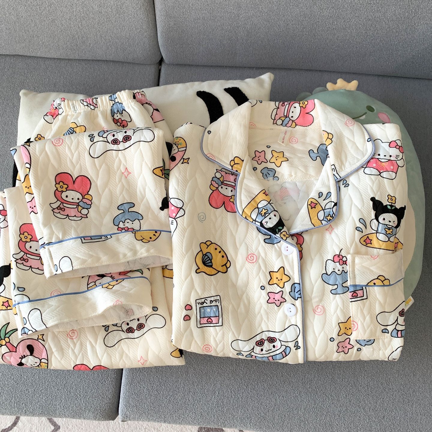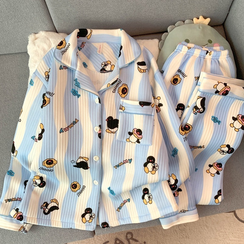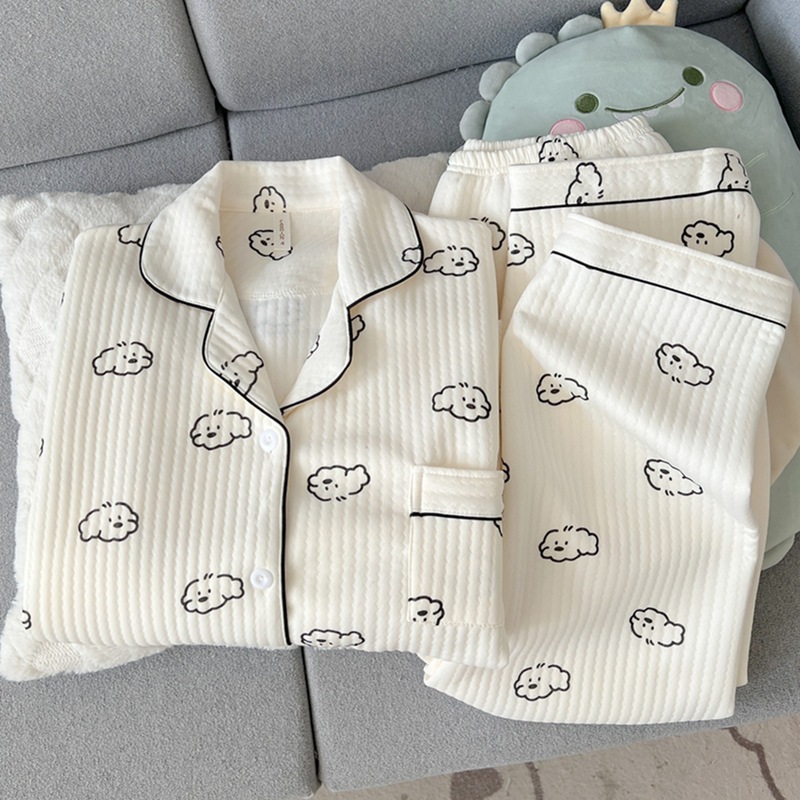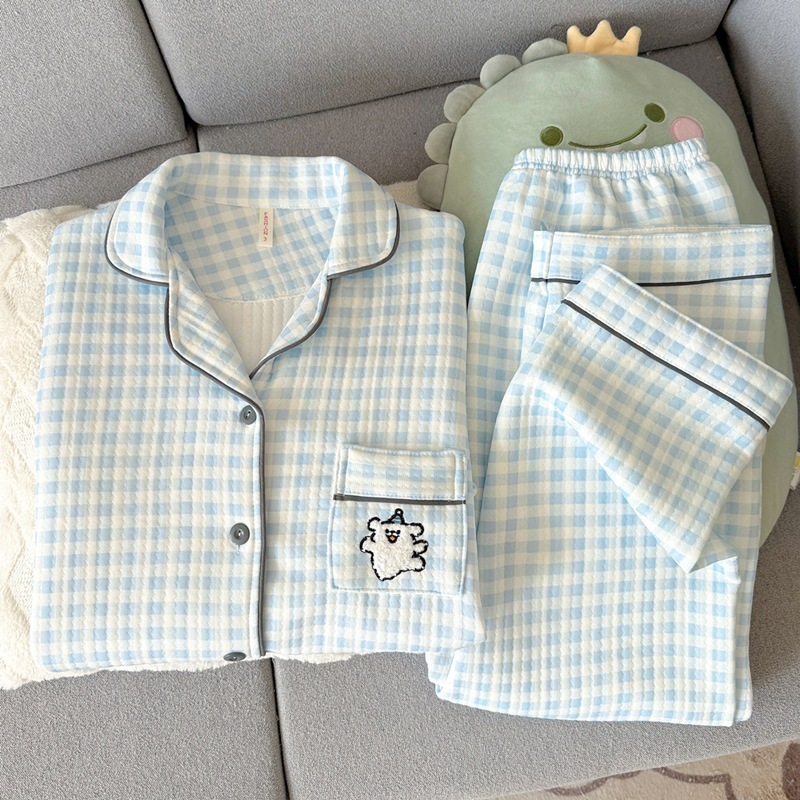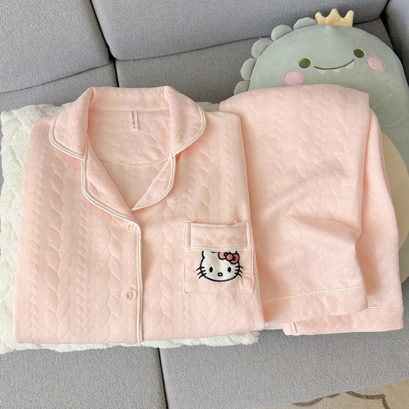 ドット刺繍猫柄レイヤードセットパジャマ女性用秋冬エアコットン厚手保温長袖学生ホームウェア