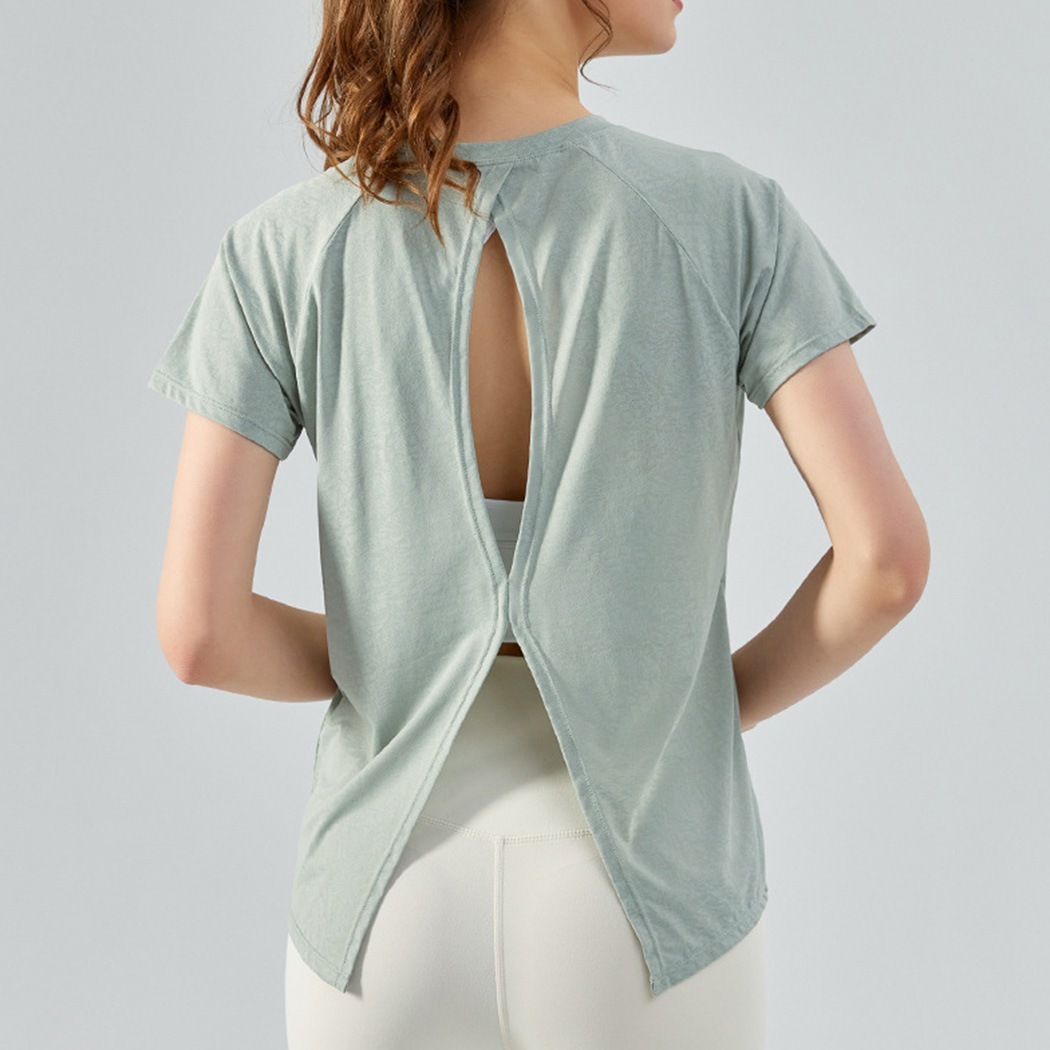 ヨガウェア トップス 半袖 レディース ピラティス スポーツ Tシャツ カットアウト バックスリット クルーネック ラグランスリーブ 黒 白