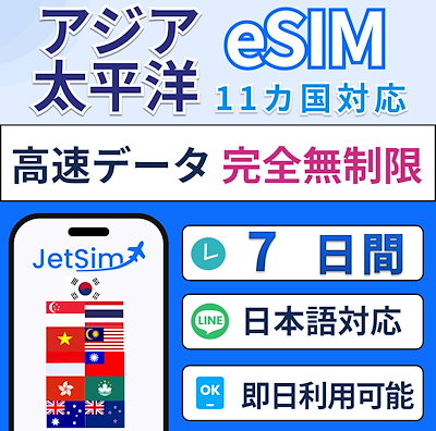 アジア 太平洋 eSIM 7日間 高速データ無制限 シンガポール・香港・タイ・インドネシア・マレーシア・ベトナム含む 即日発行 テザリング可