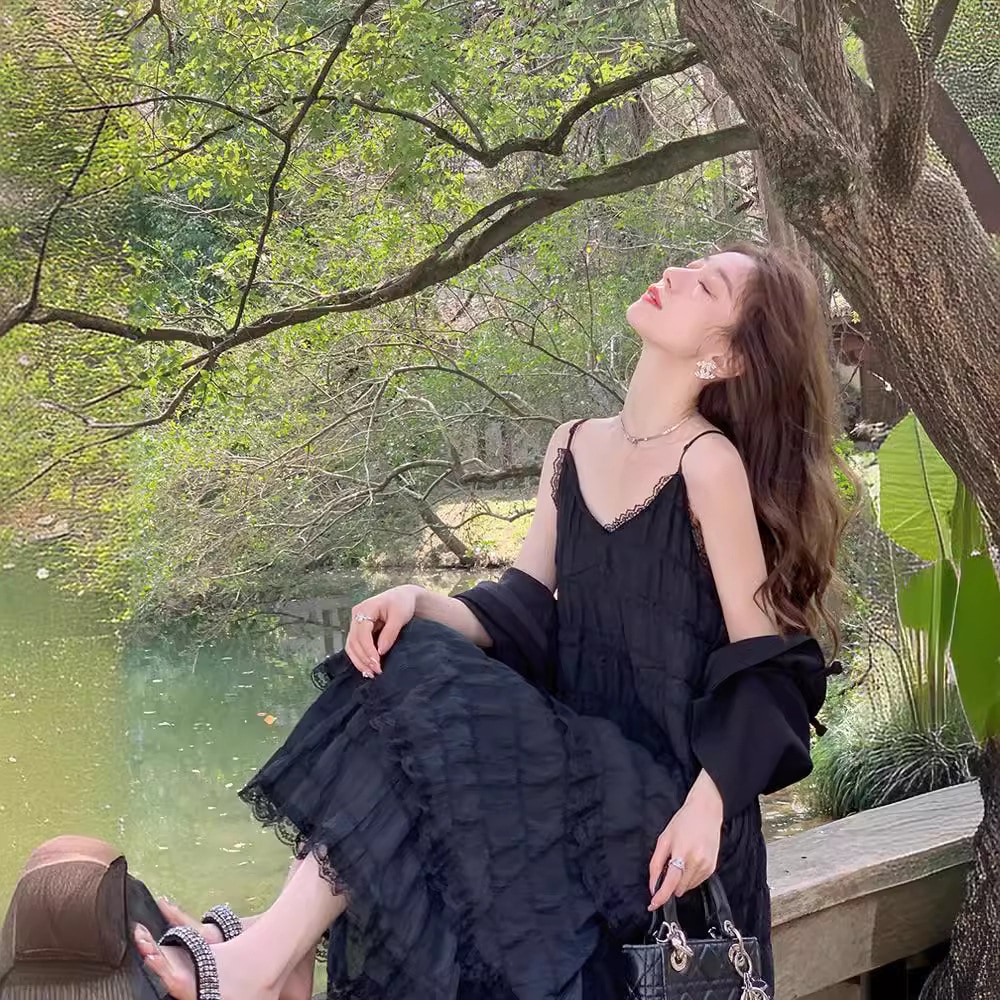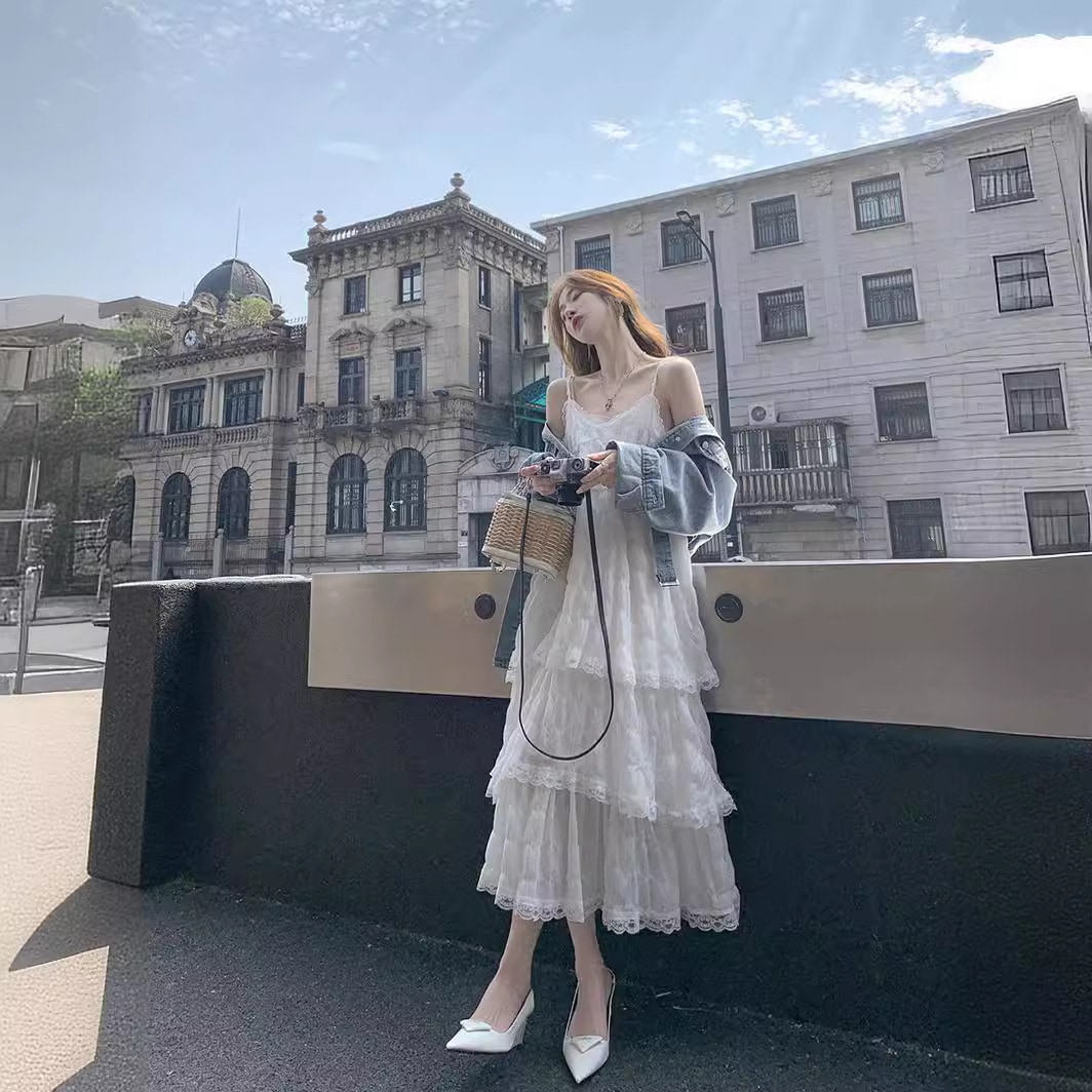 【3日発送】2026春新作 レースキャミワンピース レイヤード 細見え デート服 春コーデ 海辺リゾートビーチドレス 上品ロングドレス