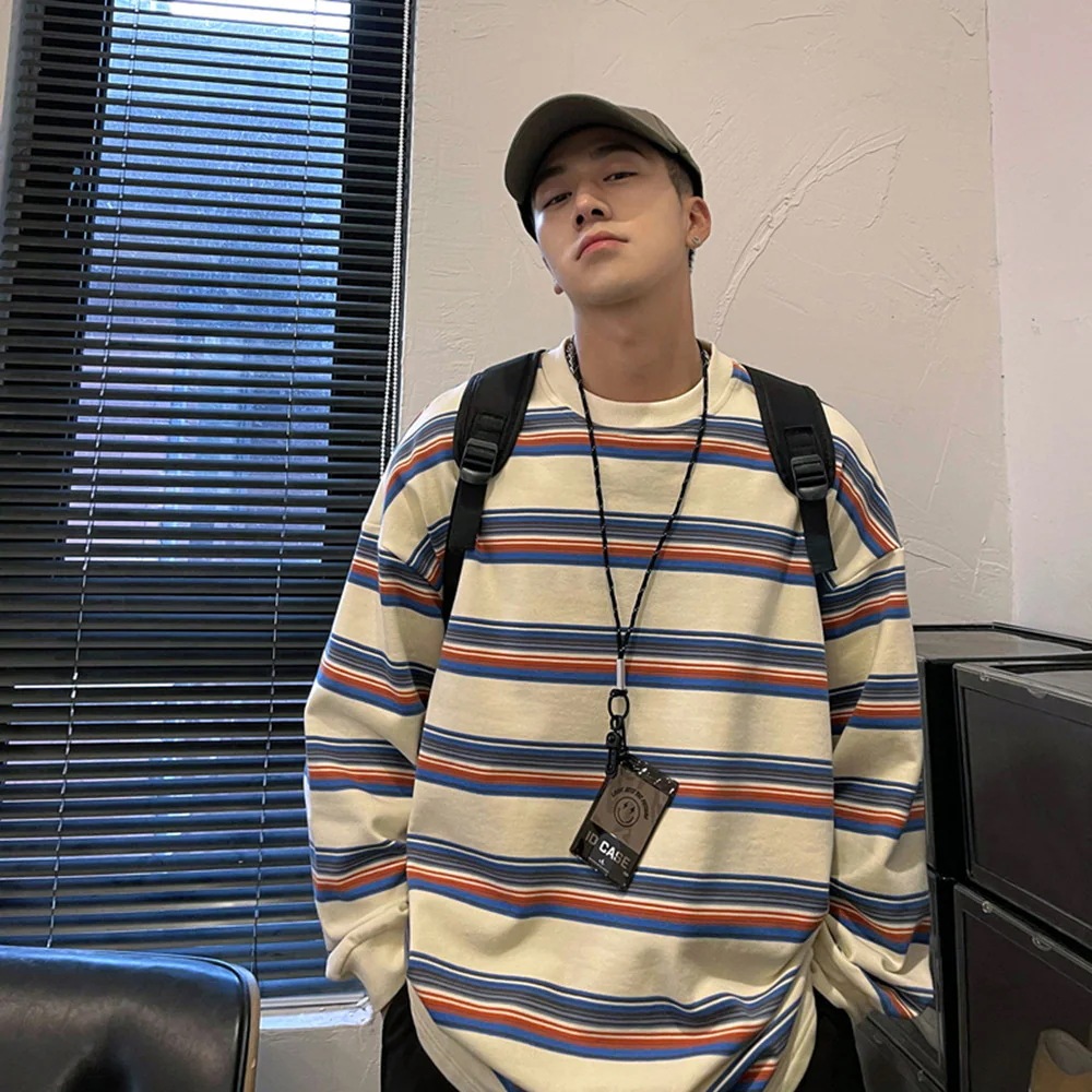 日系ストライプTシャツスウェット 男子用 ゆったり 丸首 春・秋用 ニッチなゆったりラフなトップス