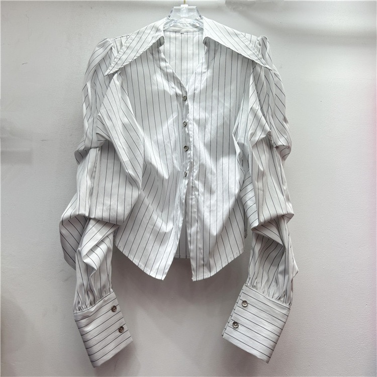 早い者勝ち 春のエレガントなストライプシャツ 襟付き長袖仕様 ウエストタックが体形をカバー 女性らしいシルエットが魅力のトップス 3カラー展開