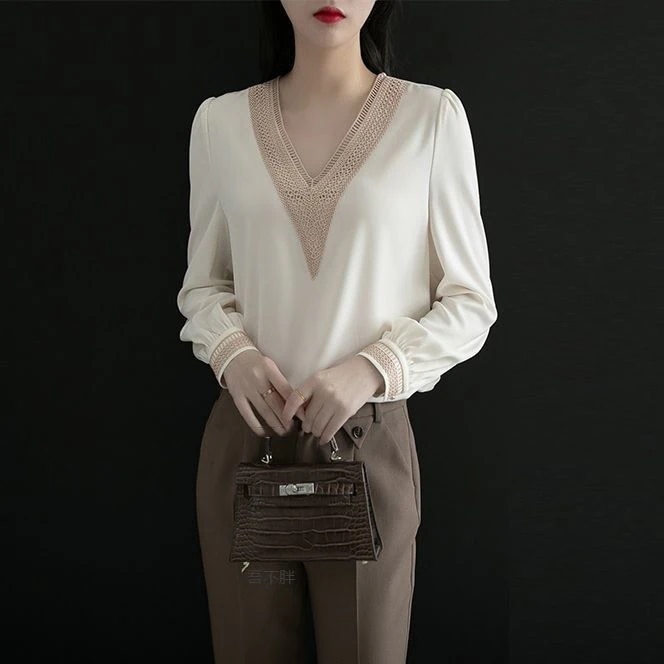 レディースVネックシフォンシャツ長袖おしゃれブラウスファッション万能インナートップス[2カラー]