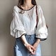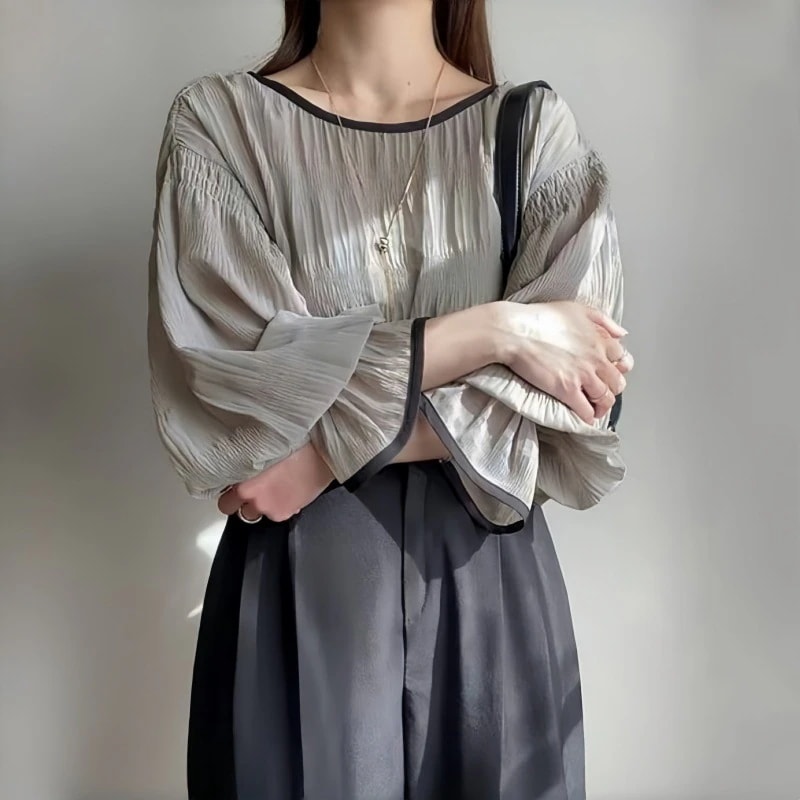 日韓夏新作レディース 単色テクスチャープリーツパフスリーブ長袖ラウンドネックプルオーバーシフォンブラウス[3カラー]