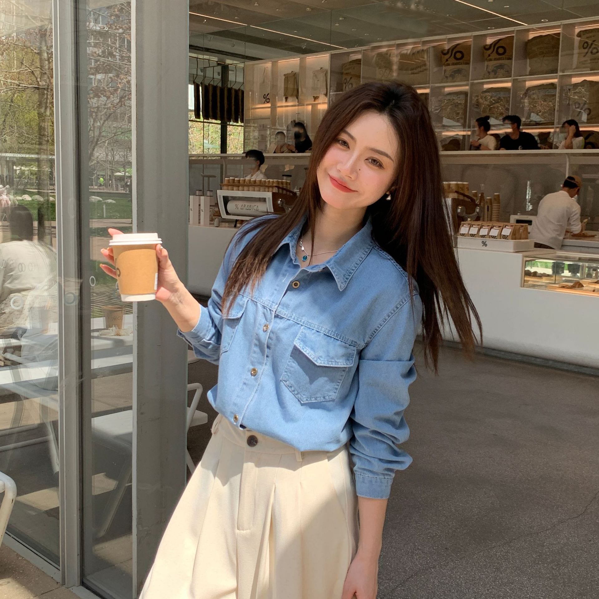 2026年春トップス レトロ風 ネイビー レトロ ストレートショルダー 香港風 ソフトデニムシャツ レディース