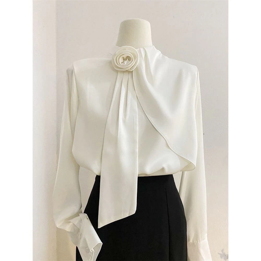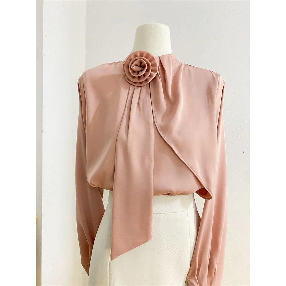 フレンチサテンシャツ女性用2026デザイン感ある立体花柄リボン付き長袖ブラウス