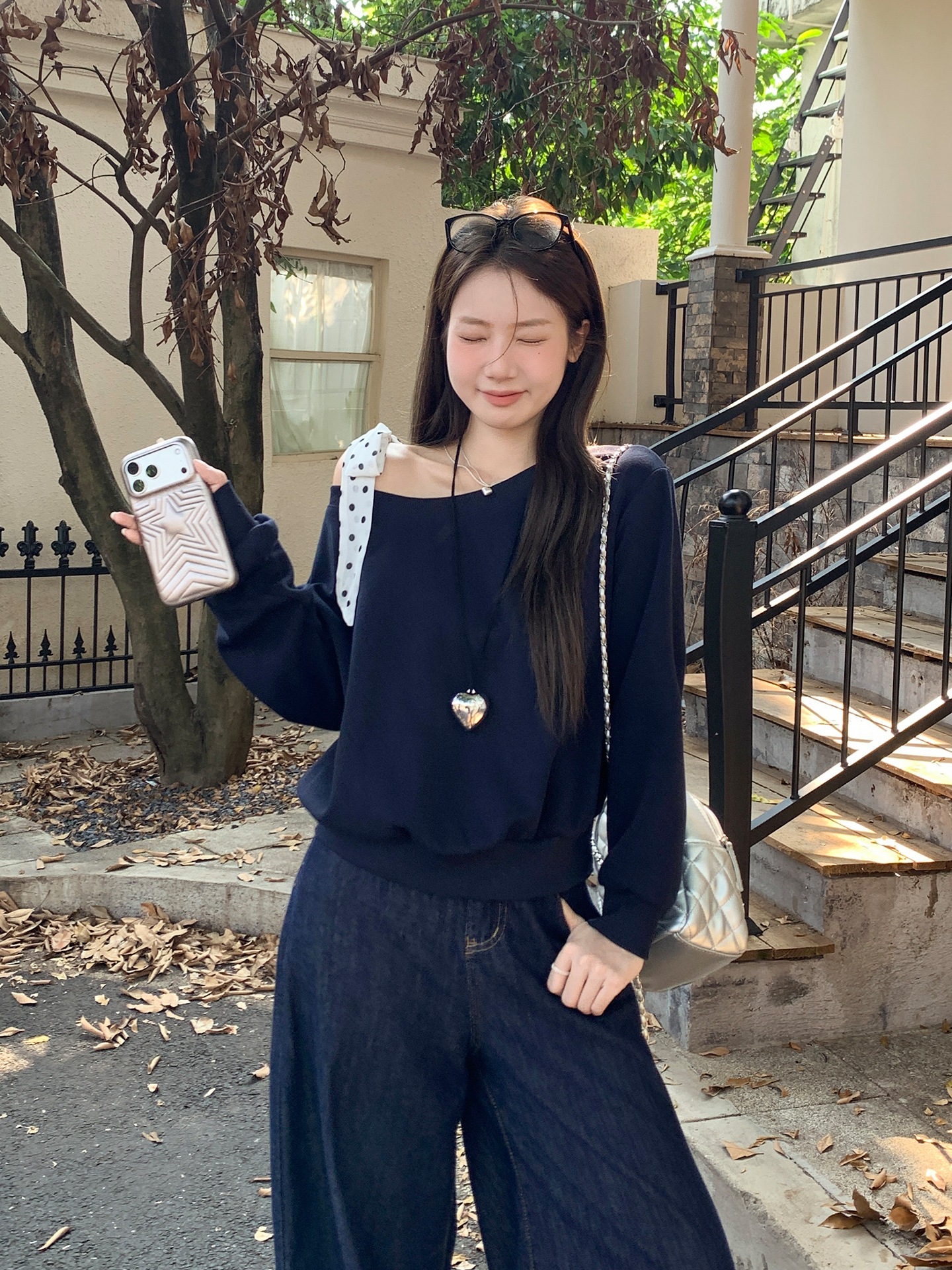 ドット柄紐付きオフショルダーリボン長袖スウェット ゆったりインナートップス