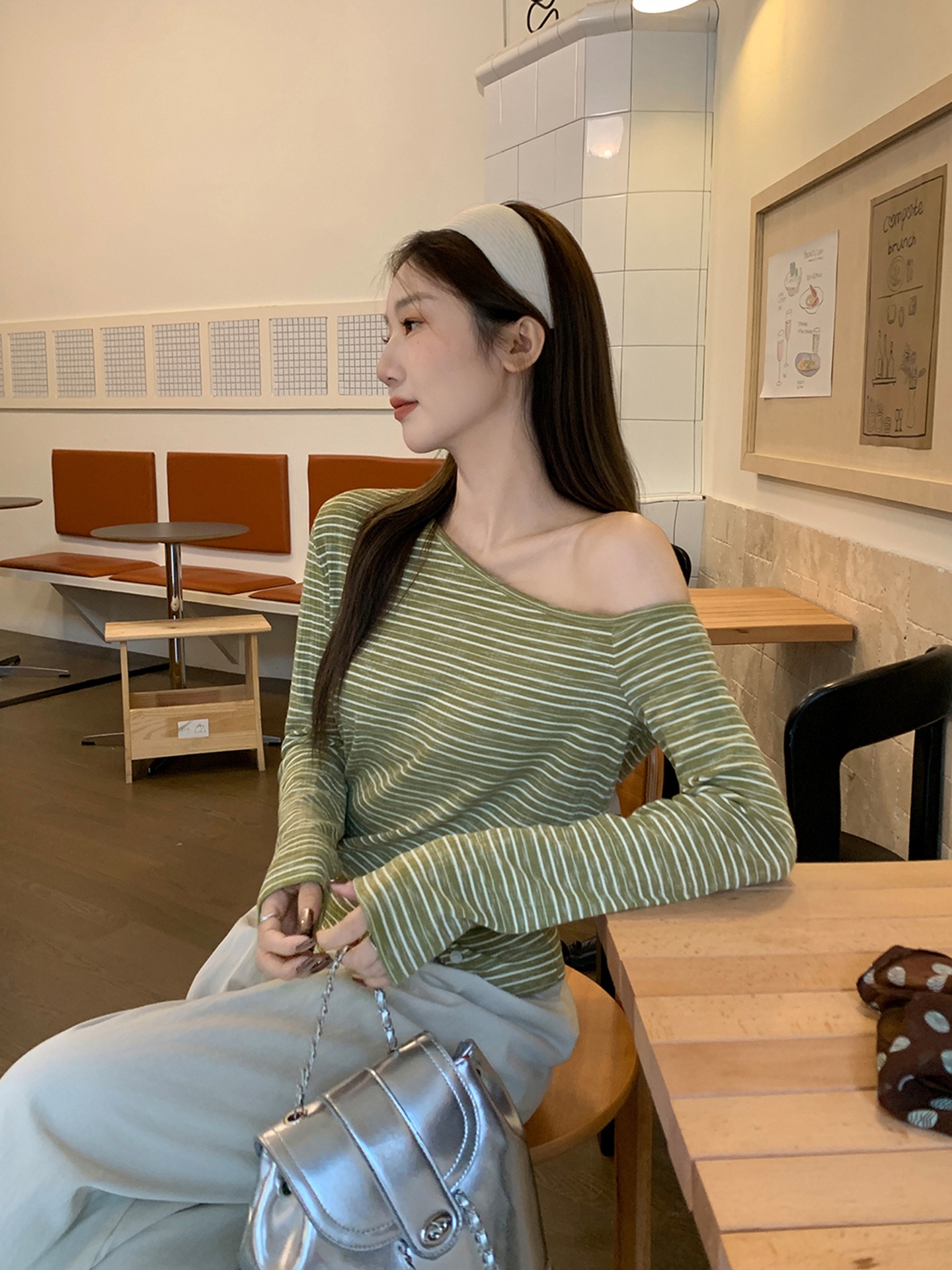 ストライプボタン付き斜めネックオフショルダートップス新作ゆったり長袖トップス