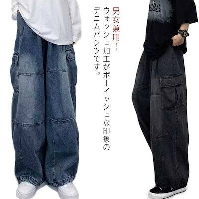 デニムパンツ メンズ ジーンズ ロングパンツ ワイドデニム ワイドパンツ ルーズ ビッグシルエット 大きいサイズ ウォッシュデニム パンツ レトロ ストリート風 大きいポケット 男女兼用 体型カバー0