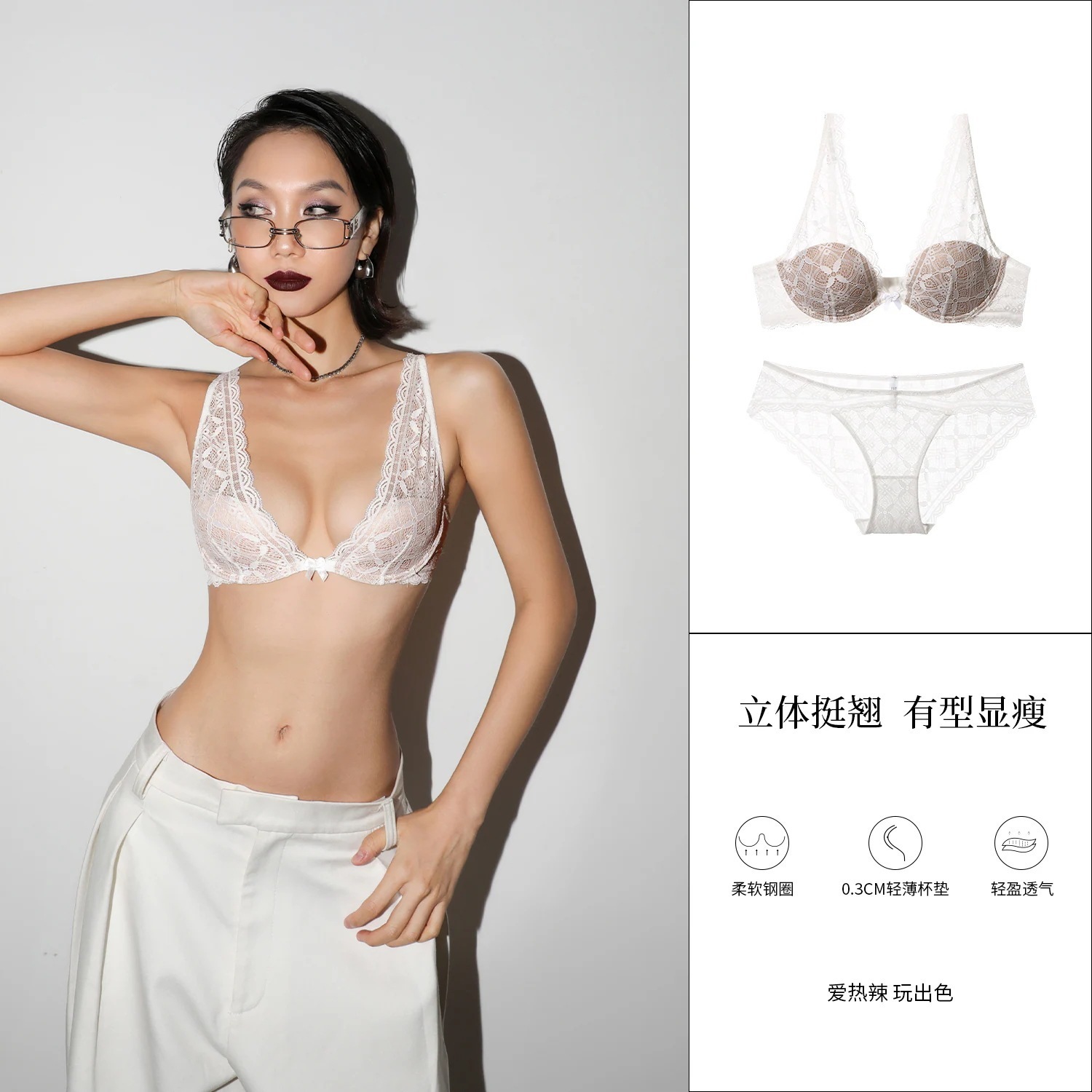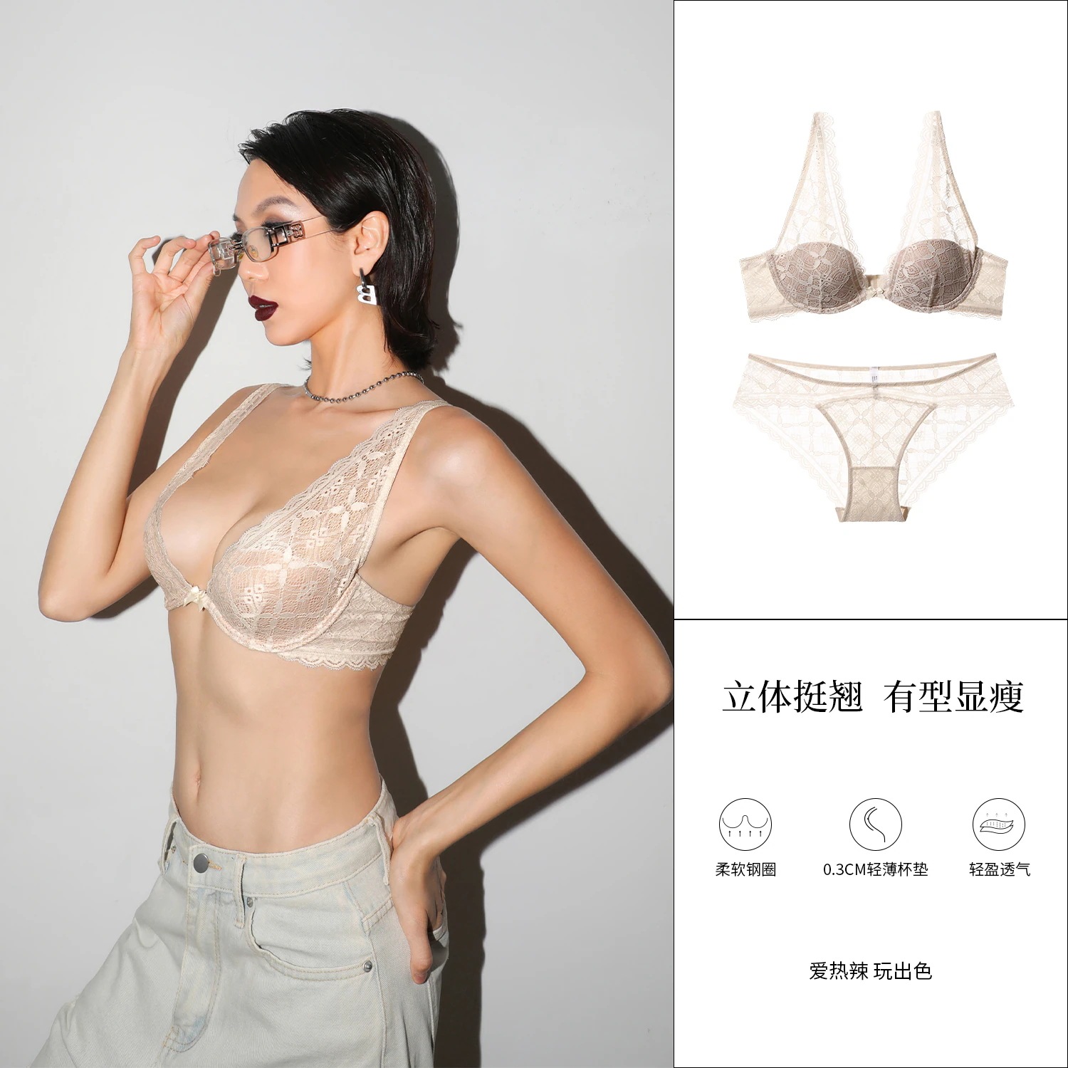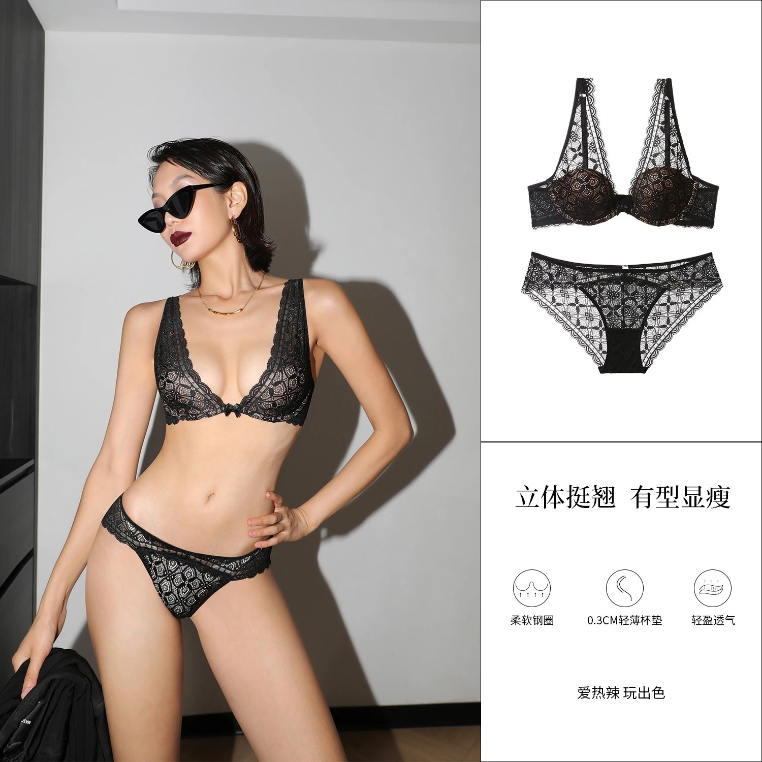 【3日出荷】レースブラ 小さい胸 ディープ V 脇肉キャッチ 下垂防止 ブラック 薄手 上下セット