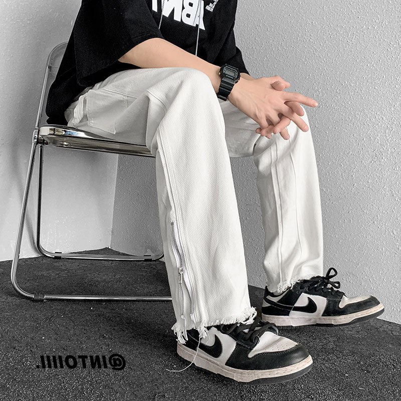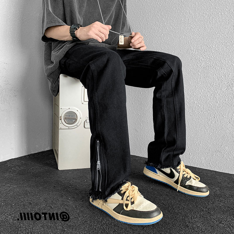 ブラックデニム メンズ子用 秋季レトロ ハイストリートトレンドブランド スリムフィットストレートロングパンツ ワークウェア風ジッパーパンツスタイル