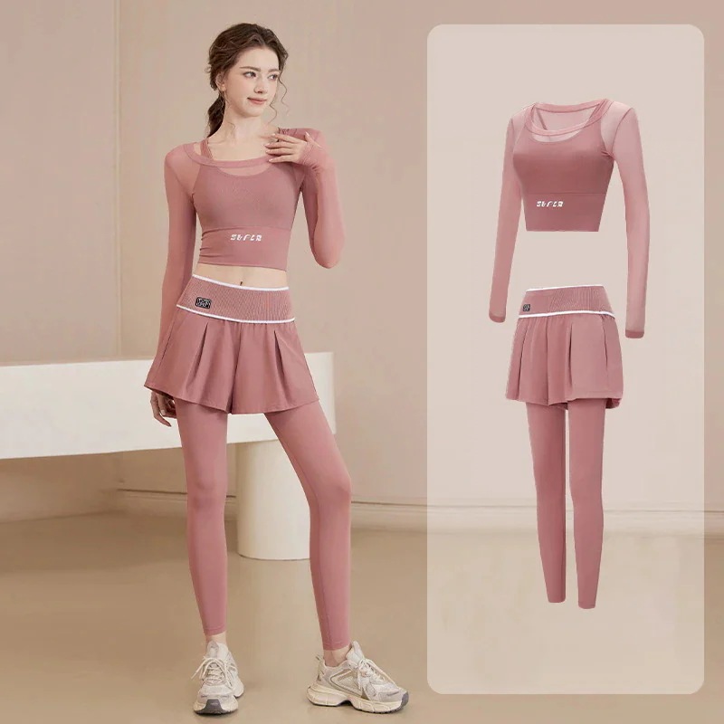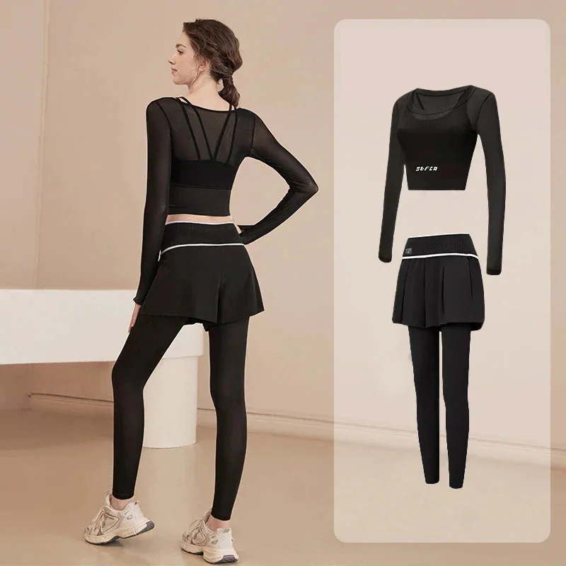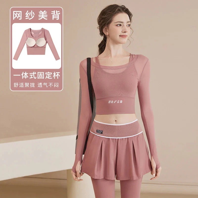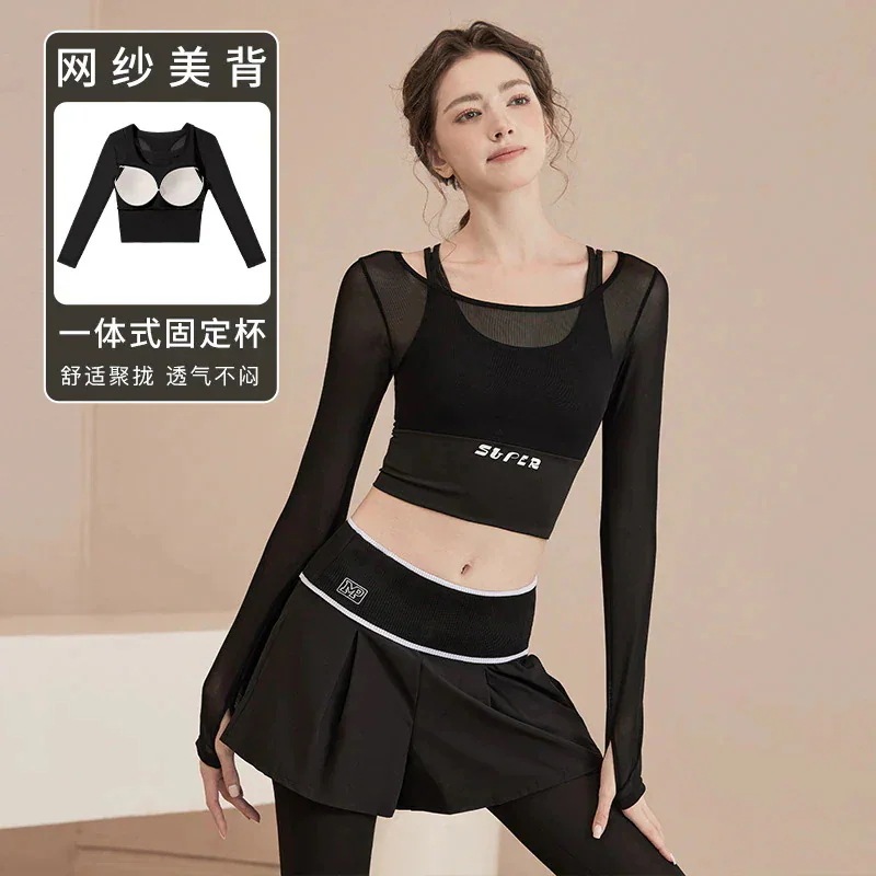 2026年 新商品 爆発的人気商品 おしゃれヨガウェアヨガウェア女性スーツランニングスポーツ偽2ピース新しい長袖フィットネストップサイクリングピラティストレーニング服 速乾 服