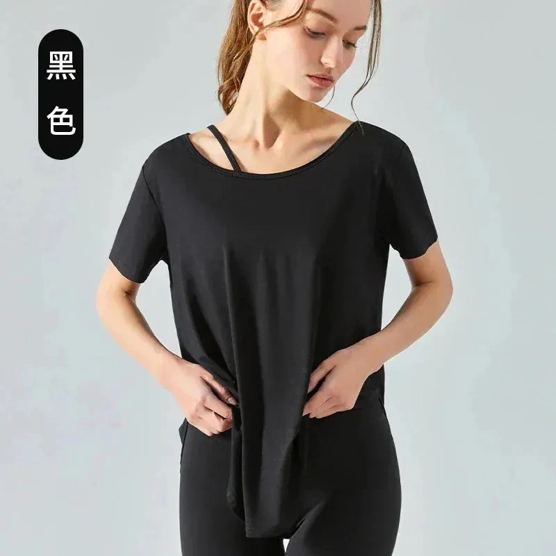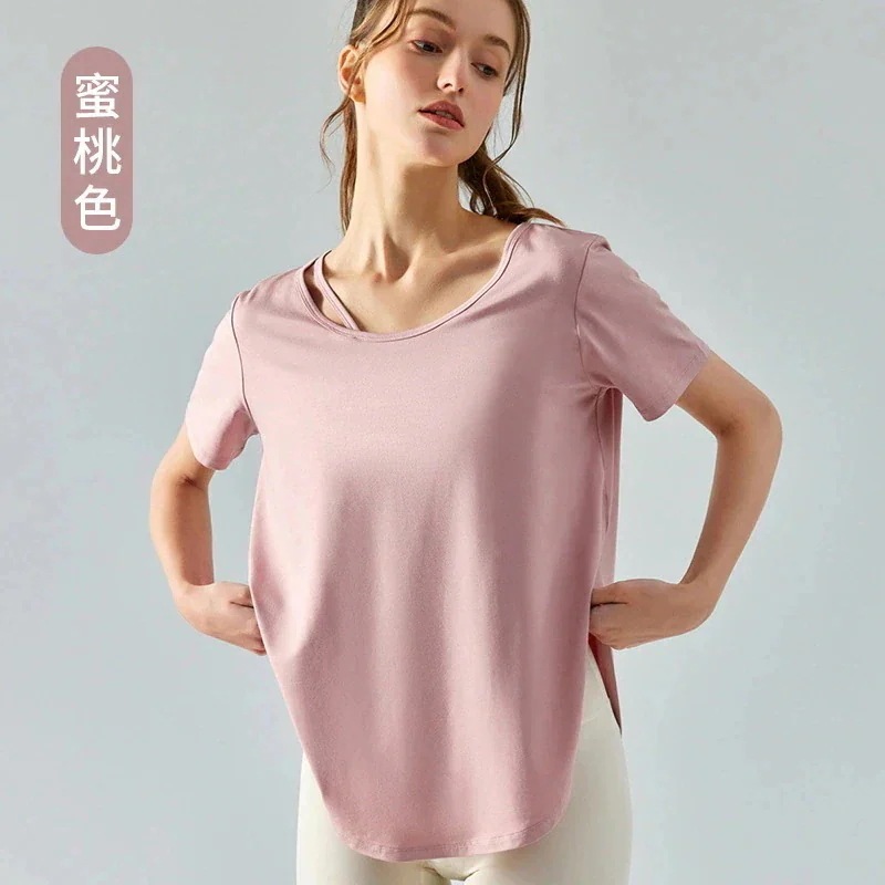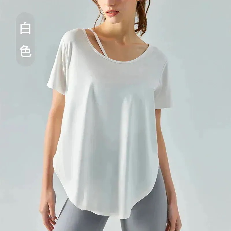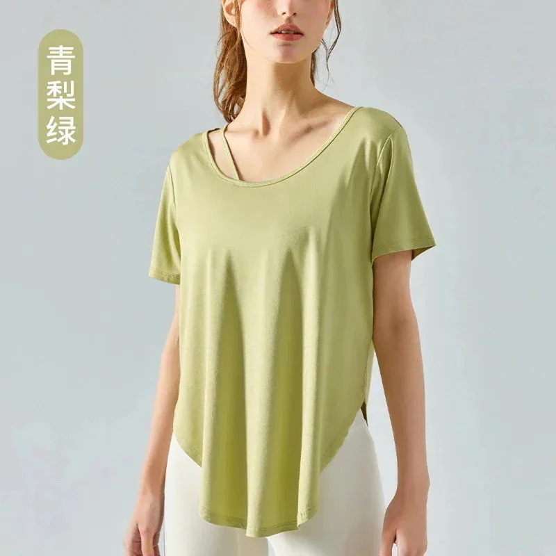 2026年 新商品 爆発的人気商品 夏の新作ヨガ半袖Tシャツ 女性ラウンドアーク裾薄フィットネストップス ゆったりとした通気性の良いロングヨガウェア