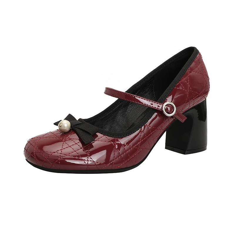 メリージェーンシューズ ハイヒール 2026 新款 小眾デザイン ワンワン風 キルティング リボン ラウンドトゥ 太ヒールパンプス