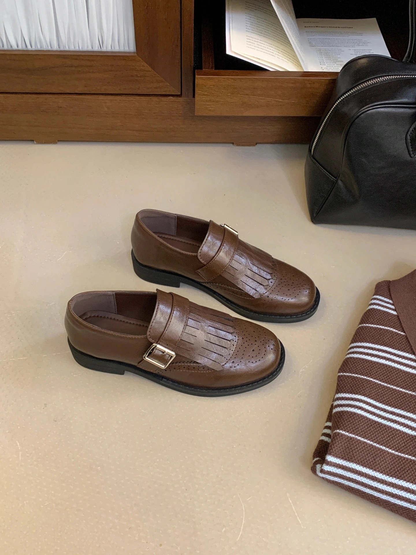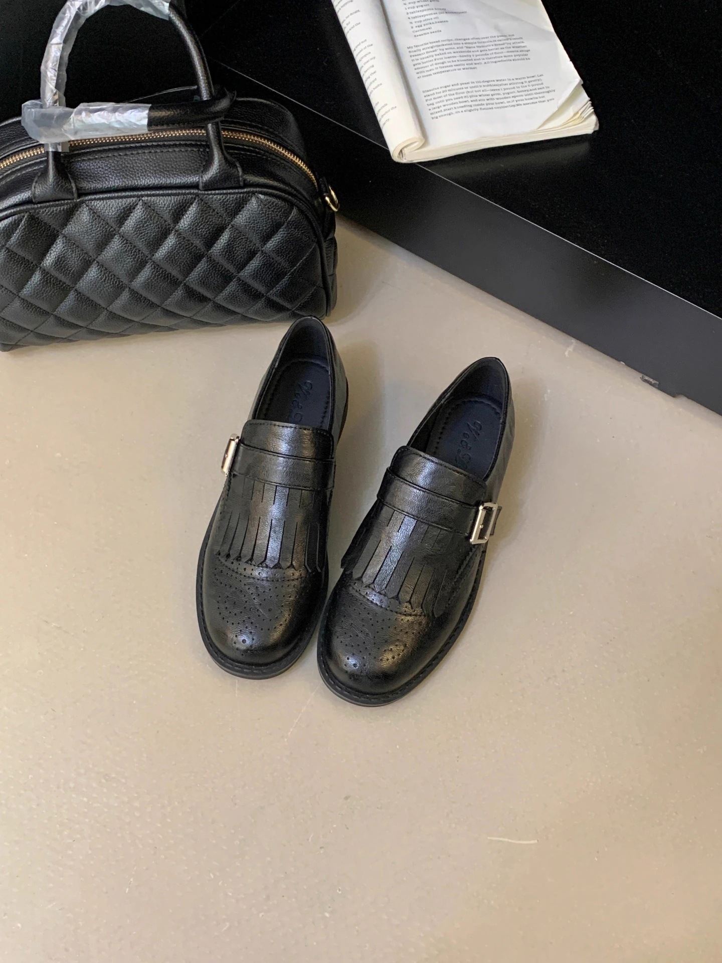 【3日出荷】ブリティッシュ風 フリンジ ソフトソール パンプス ローファー レディース冬 ボア 新作 スリム バックルレザーシューズ