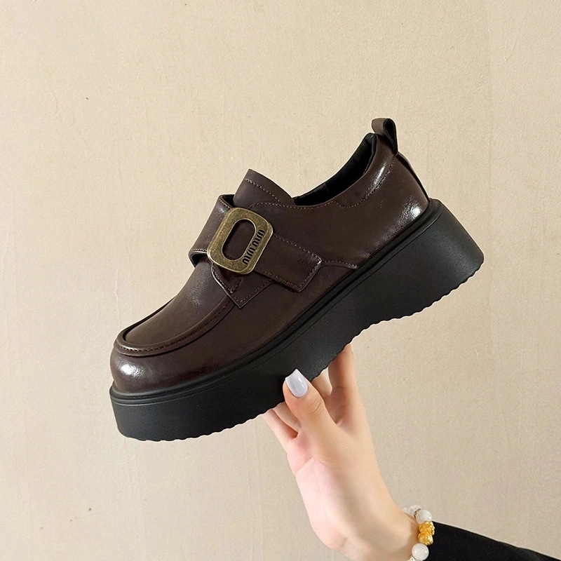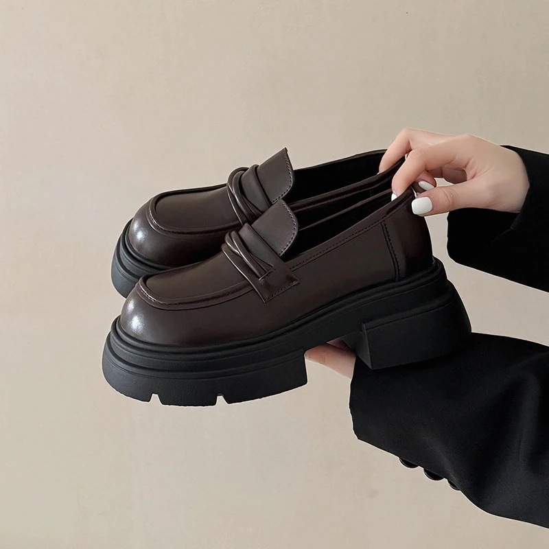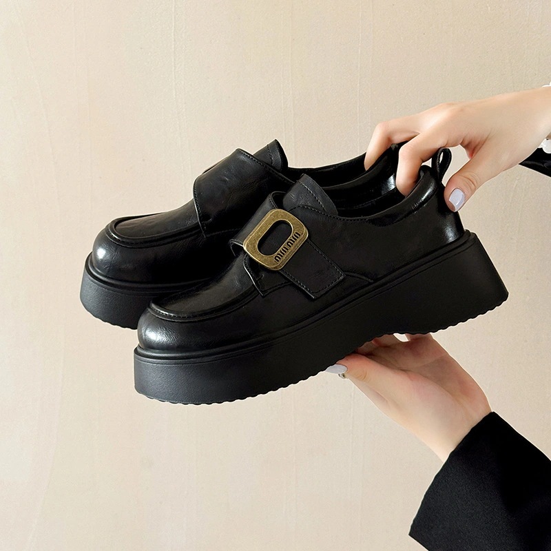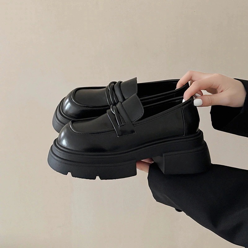 【3日出荷】厚底 本革 ブリティッシュ風レザーシューズ レディース春新作 スリッポンパンプス ブラック ローファー