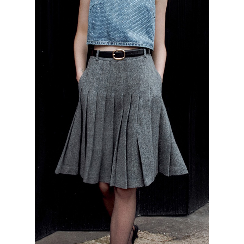 【3日出荷】春先新作 グレーミックス ヘリンボーン スリット入りプリーツスカート