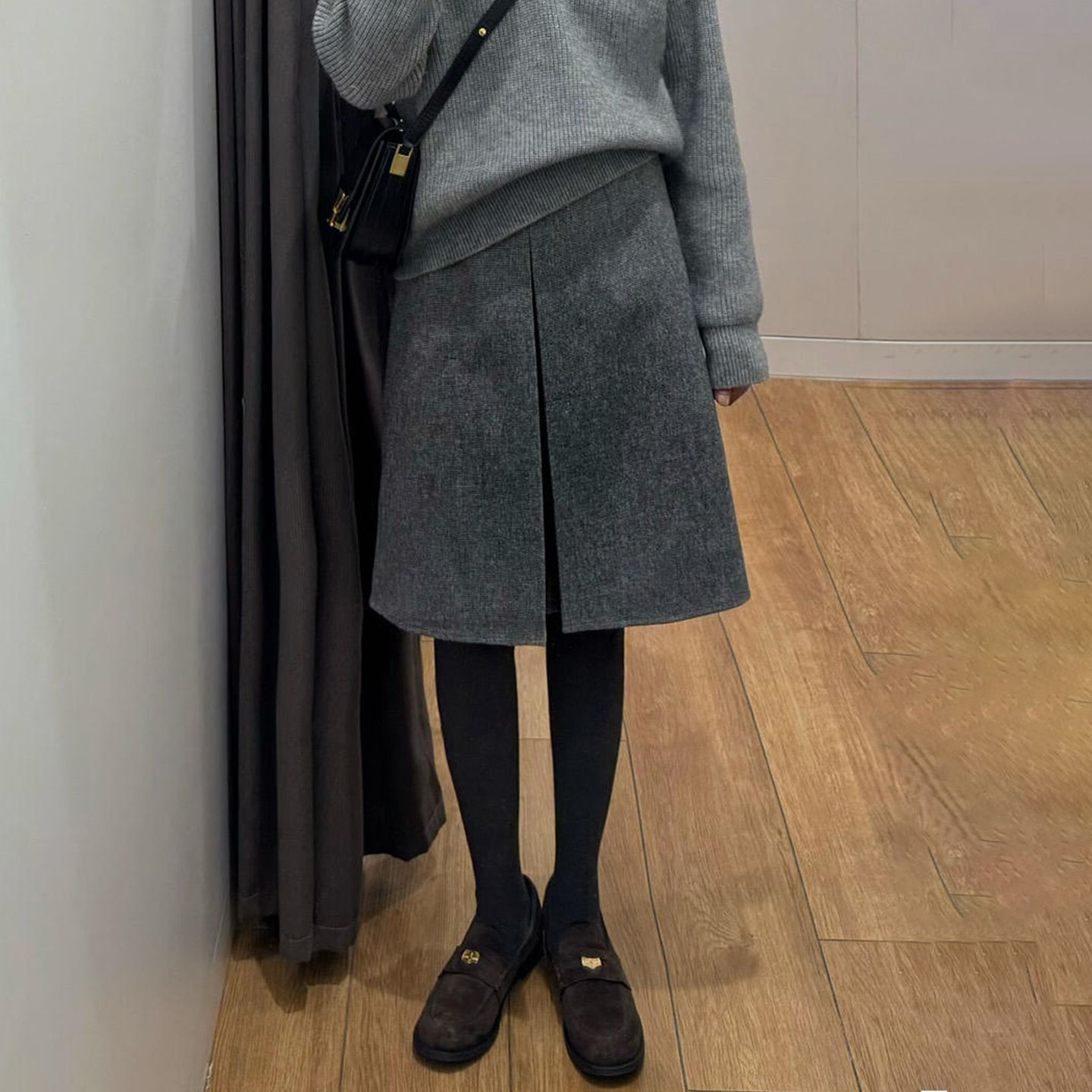 【3日出荷】ライトグレーウールスカート 秋ハイウエスト Aライン ミモレ丈