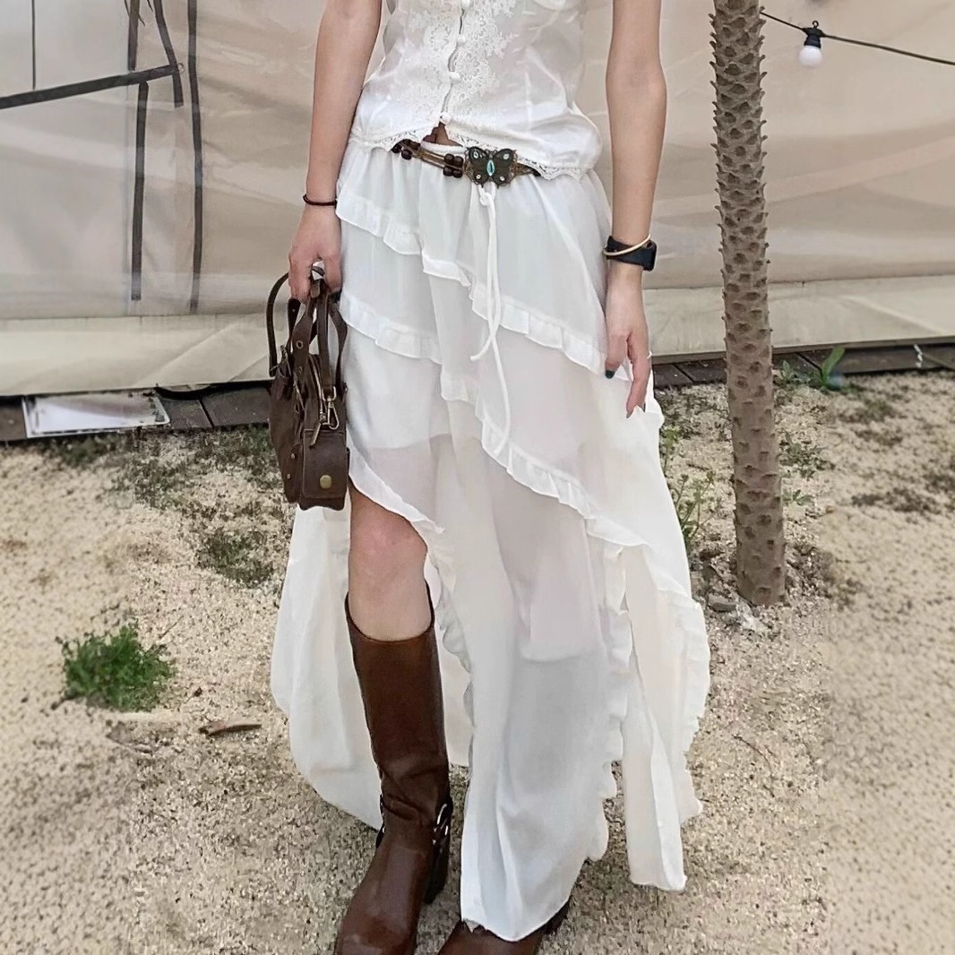 【3日出荷】森ガール系 フレンチ 清楚系 ロングスカート ホワイト スリット入り 変形デザイン 夏 ゆるっとスカート