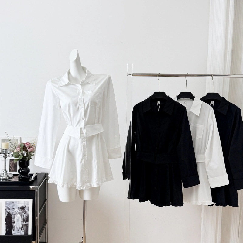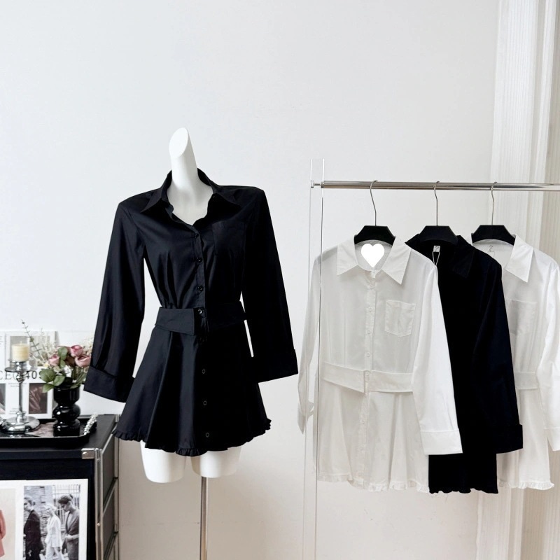 【3日出荷】フェイクレイヤードシャツワンピ レディース新作 フリル スリムワンピース