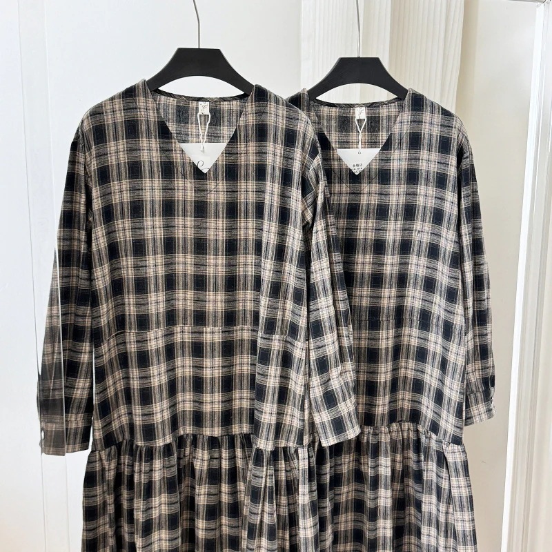【3日出荷】シャーリングデザイン ネック チェック柄 ゆったりワンピ レディース春 リゾートロング丈ワンピース