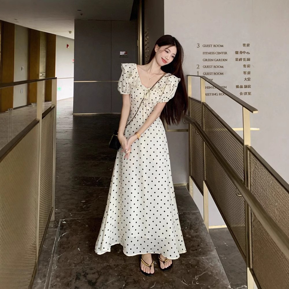 花柄ワンピース フリル袖フリルウエストドレス夏新作リゾート風アプリコットドットロングドレス