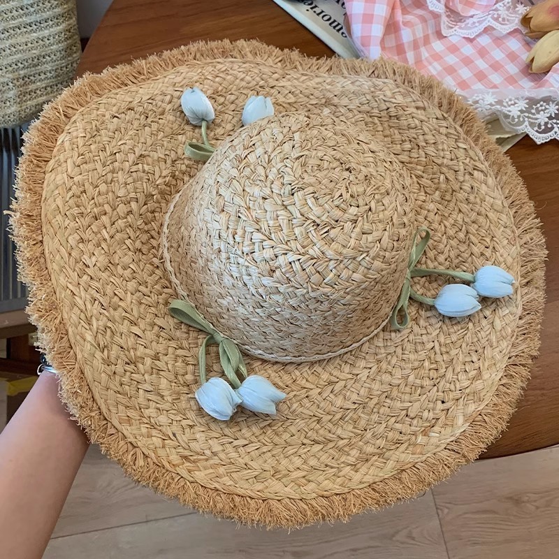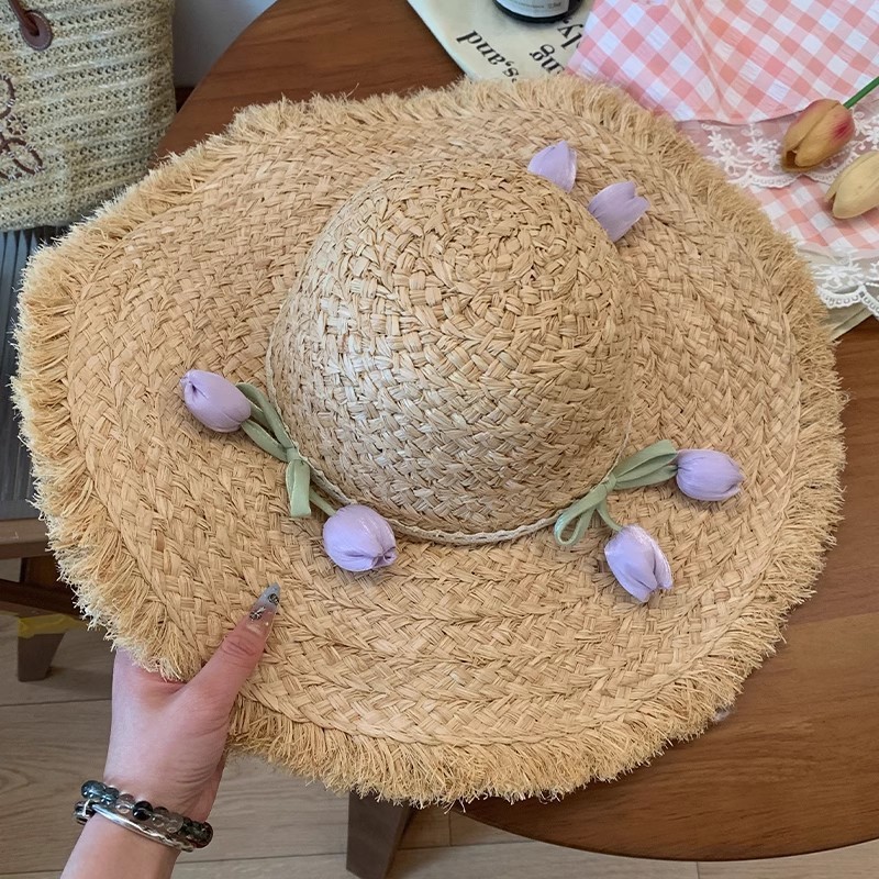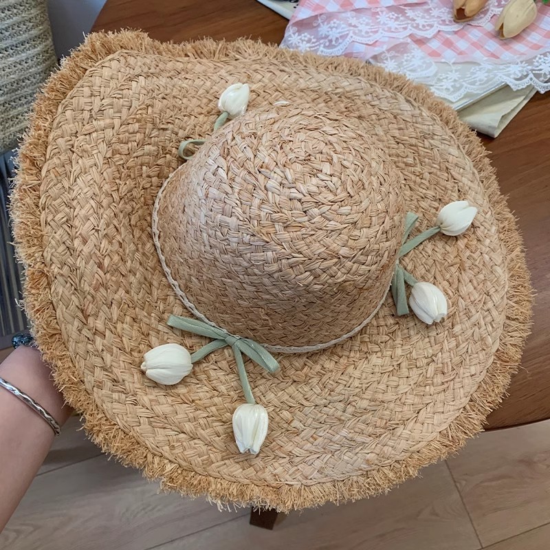 スイートチューリップイミテーションラフィアハット夏の海辺での休暇大きなつばのビーチハットサンハット