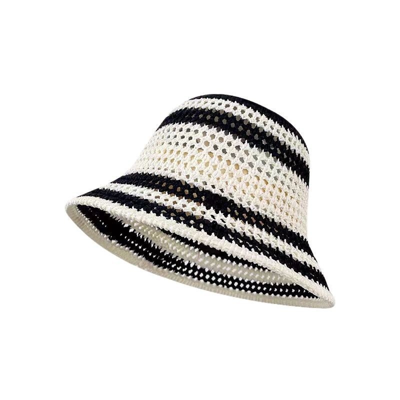 ベイシンハット中空ニットフィッシャーマンハット春夏カラーブロックストライプサンハット